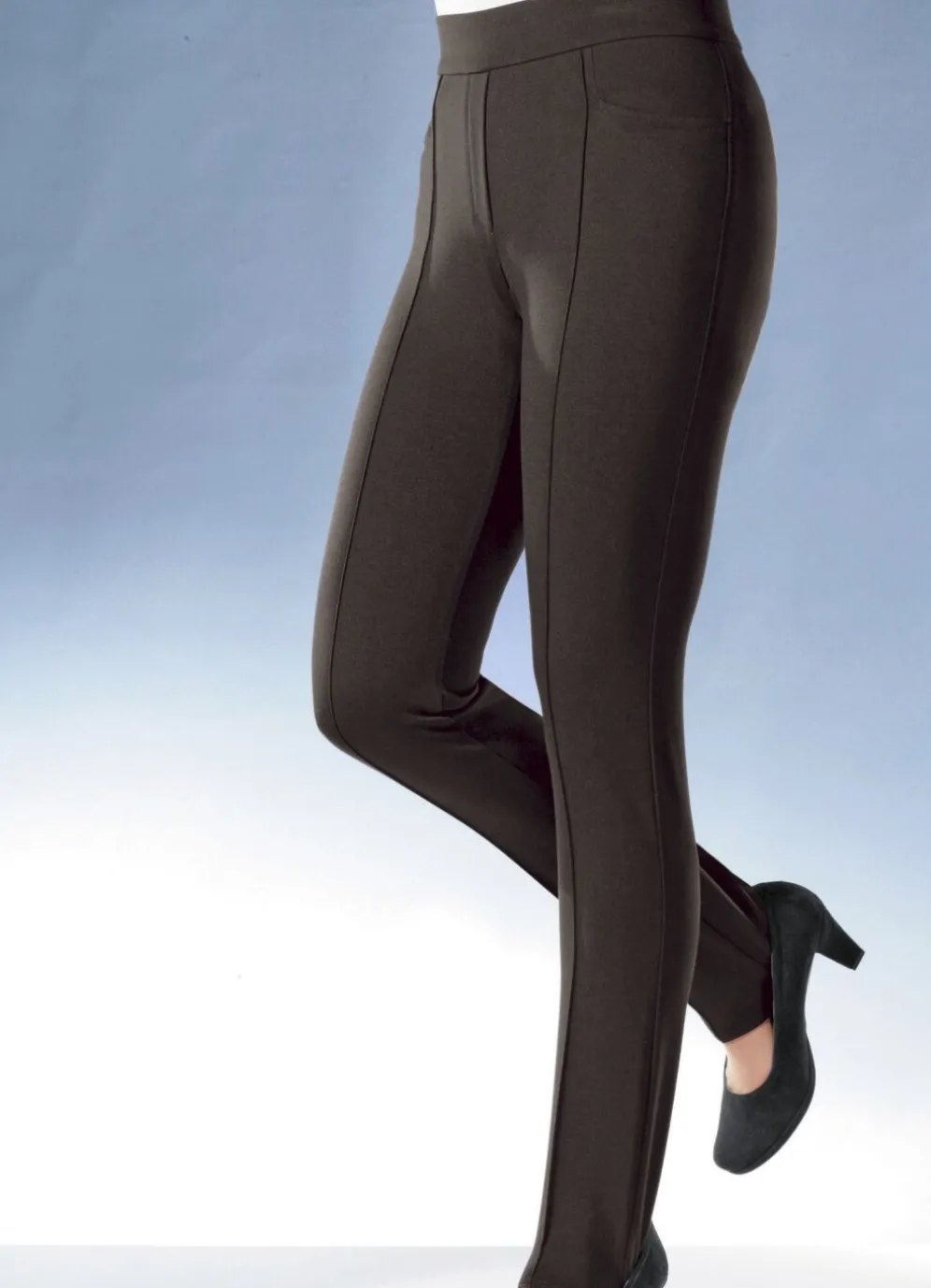 Ihr Modell BECKY – topakuelle Steghose in komfortabler Schlupfform, glatt anliegend dank des innenliegenden, „unsichtbaren“ Rundum-Dehnbundes, Reißverschluss-Zierblende vorne, Seitentaschen, abgesteppte Biesen im Vorderteil sowie elastischer, weitenverstellbarer Steg an den Beinabschlüssen – durch die schmale Beinform auch ideal in Stiefeln tragbar ! Innenbeinlänge ca. 78 cm.