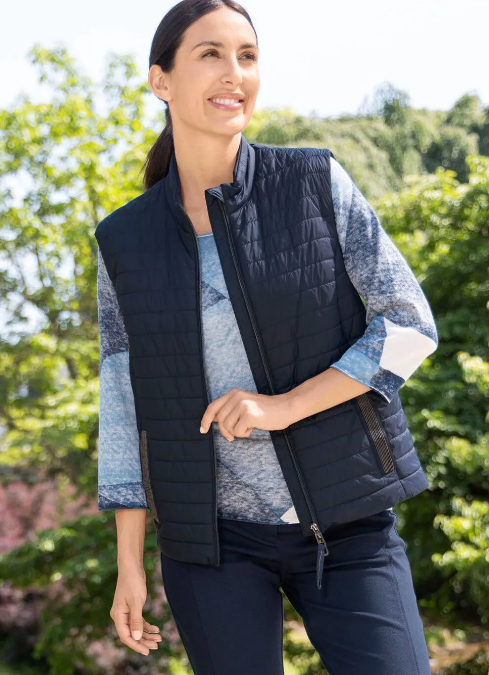 Marinefarbene Steppweste von RABE, mit sehr leichter Wattierung, Stehkragen per durchgehendem 2-Wege-Reißverschluss ganz schließbar, Reißverschlusszipper und Besätze der Schubtaschen mit dekorativem Perlchenschnürendessin, Taschenfutter, Taillierungsabnäher vorne und hinten sowie einer Innentasche.