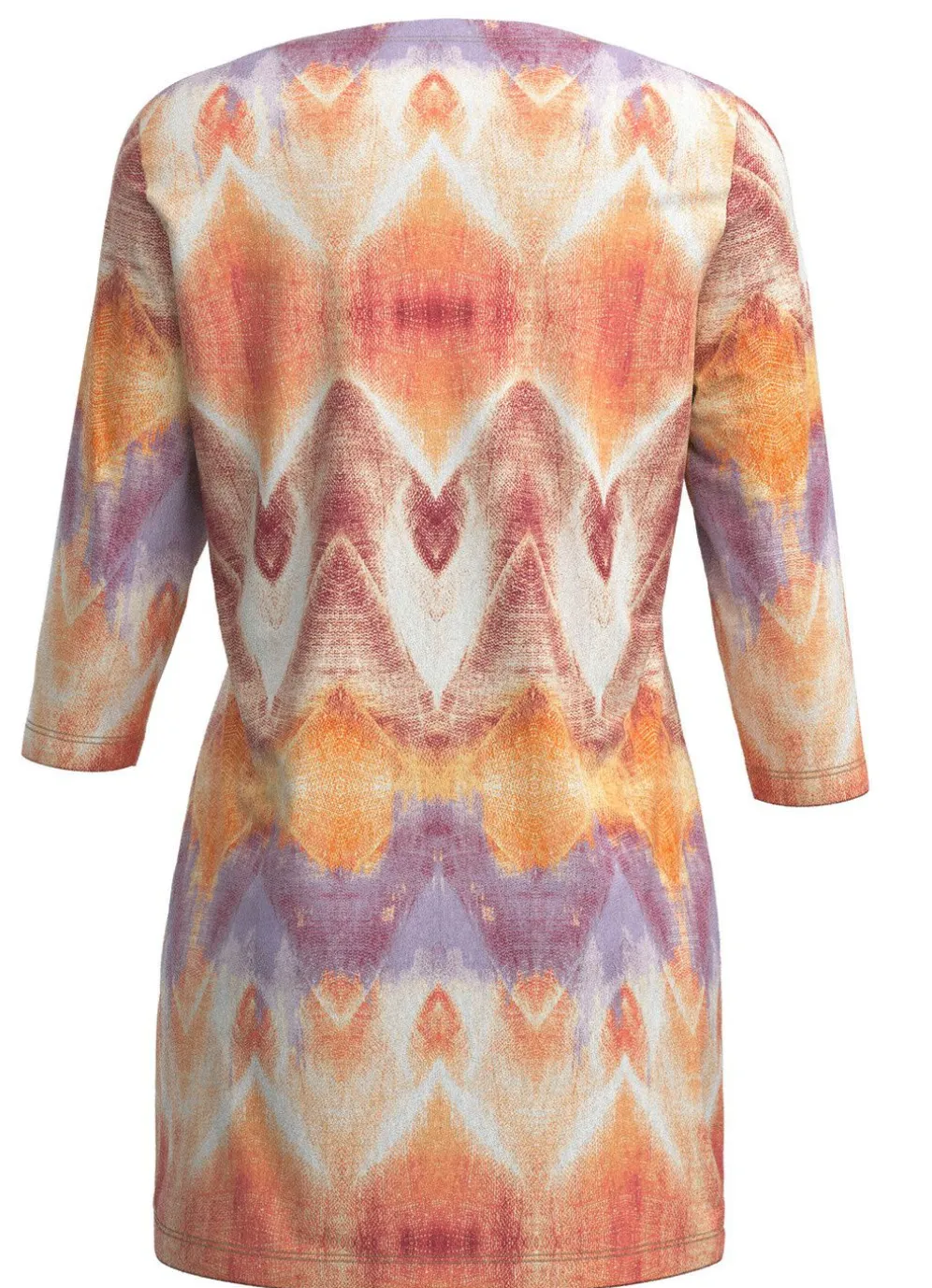 Jedes Teil ein Unikat! Strick-Tunika mit modisch flachem Halsausschnitt, farbbrillantem Alloverdruck in Ecru-Orange-Multicolor sowie 3/4-langen Ärmeln.