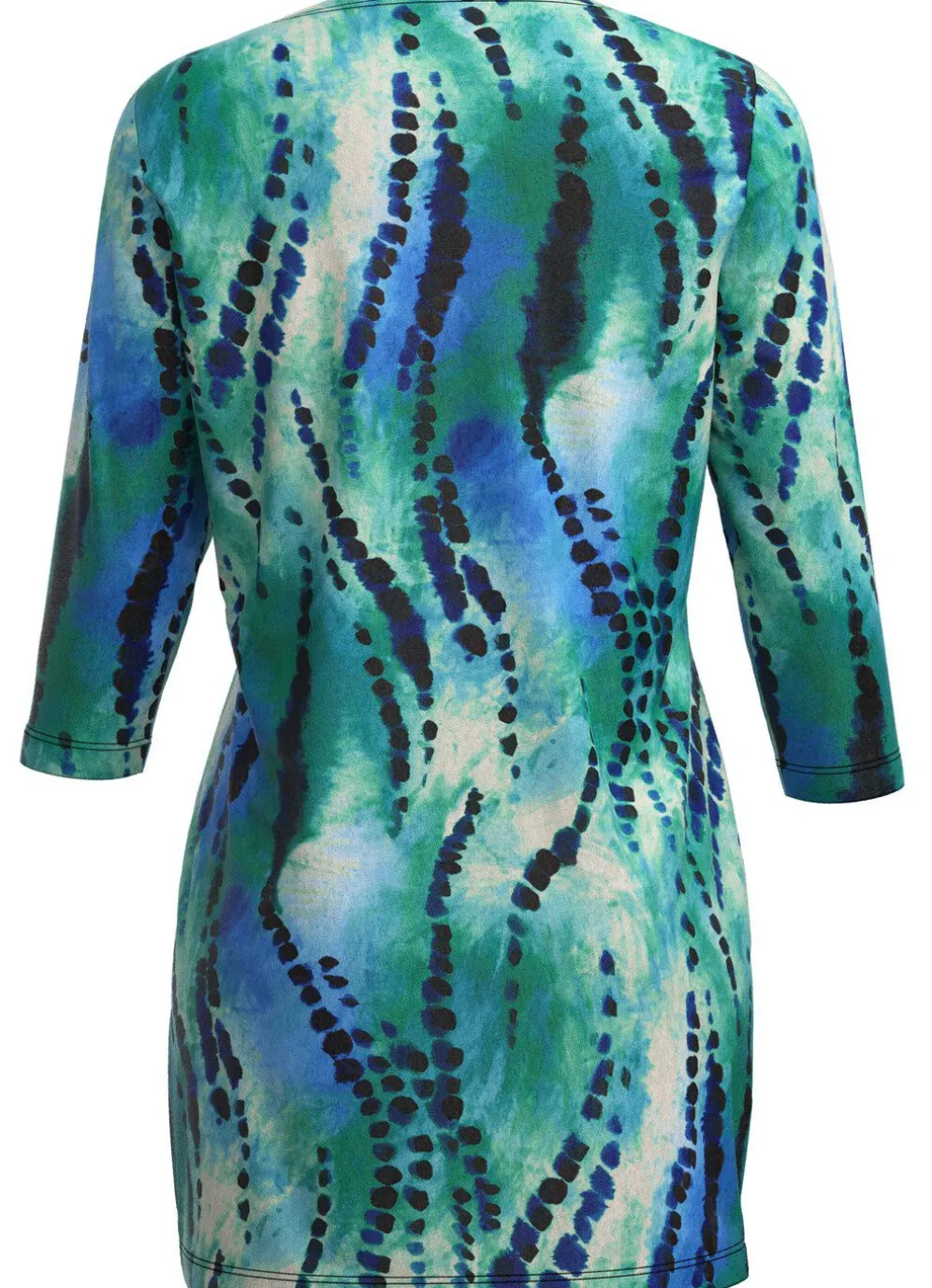 Jedes Teil ein Unikat! Attraktive Strick-Tunika in Grün-Blau, mit U-Boot-Ausschnitt, farbbrillantem Alloverdruck sowie 3/4-langen Ärmeln.