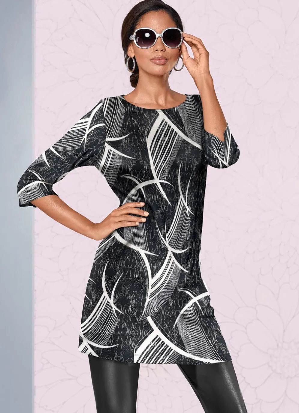 Jedes Teil ein Unikat! Außergewöhnlich schöne, schwarz-weiße Strick-Tunika in legerer Form, mit farbbrillantem Druck allover, modisch flachem Halsausschnitt sowie 3/4-langen Ärmeln.