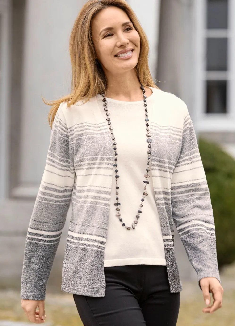 Verschlusslose Strickjacke mit langen Ärmeln sowie Streifenmuster mit Melange-Effekten rundum.