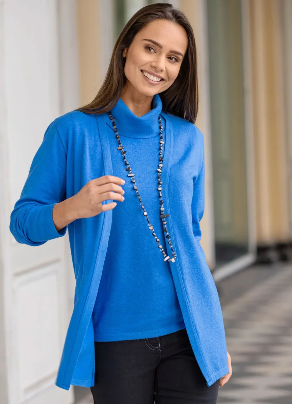 Strickjacke in verschlussloser Form, mit V-Ausschnitt sowie langen Ärmeln.