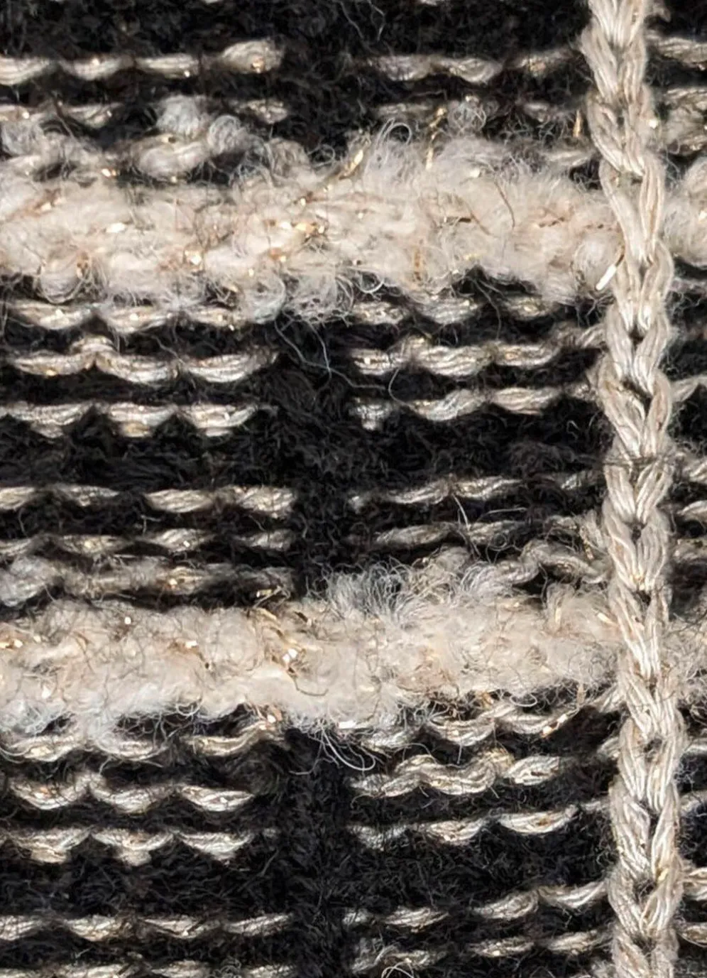 Ein Modell der Extraklasse ist diese durchgeknöpfte Strickjacke in Schwarz-Ecru: V-Ausschnitt, Strukturmix mit Effektgarn, grafisches Dessin mit goldfarbenen Glitzerakzenten allover, Kontrastblende mit Schmuckknöpfen, zwei Zierpatten mit Schmuckknopf sowie Kontrastabschlüsse an den langen Ärmeln und am Saum.