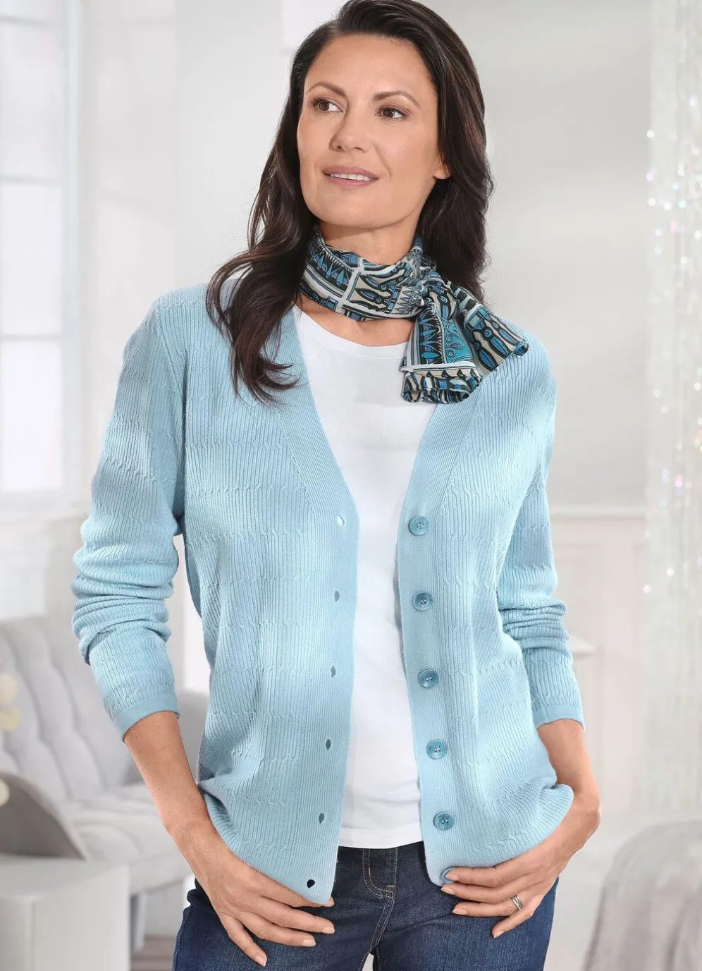 Ein idealer Kombipartner ist diese durchgeknöpfte Strickjacke mit zartem Strukturmuster allover, V-Ausschnitt, gerippter Blende sowie langen Ärmeln.