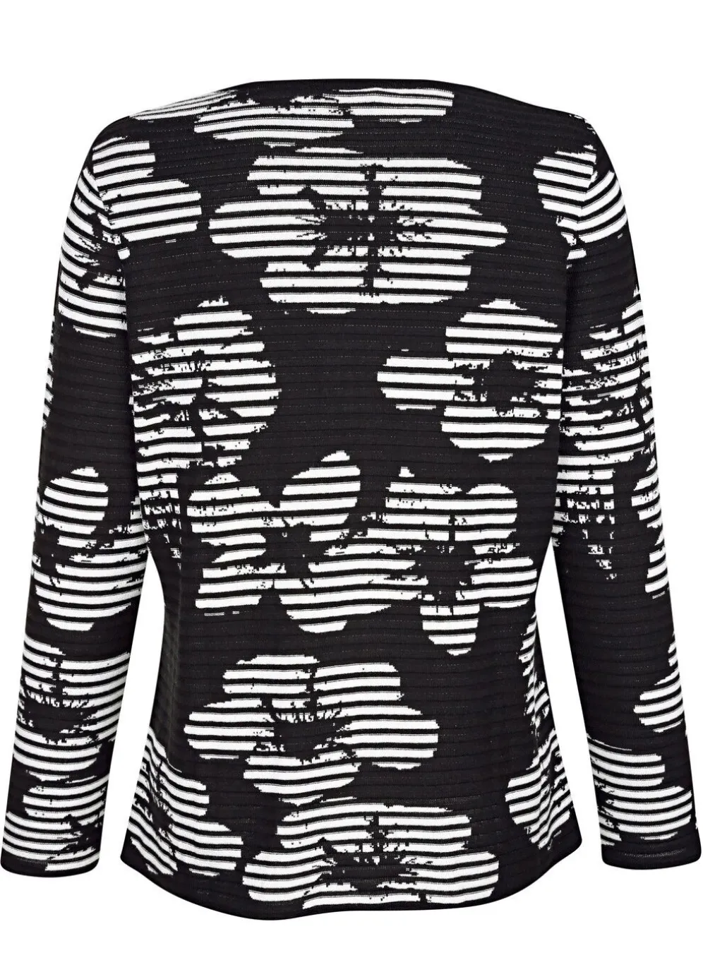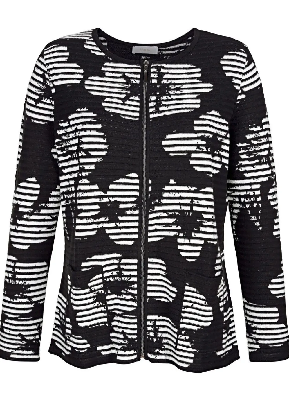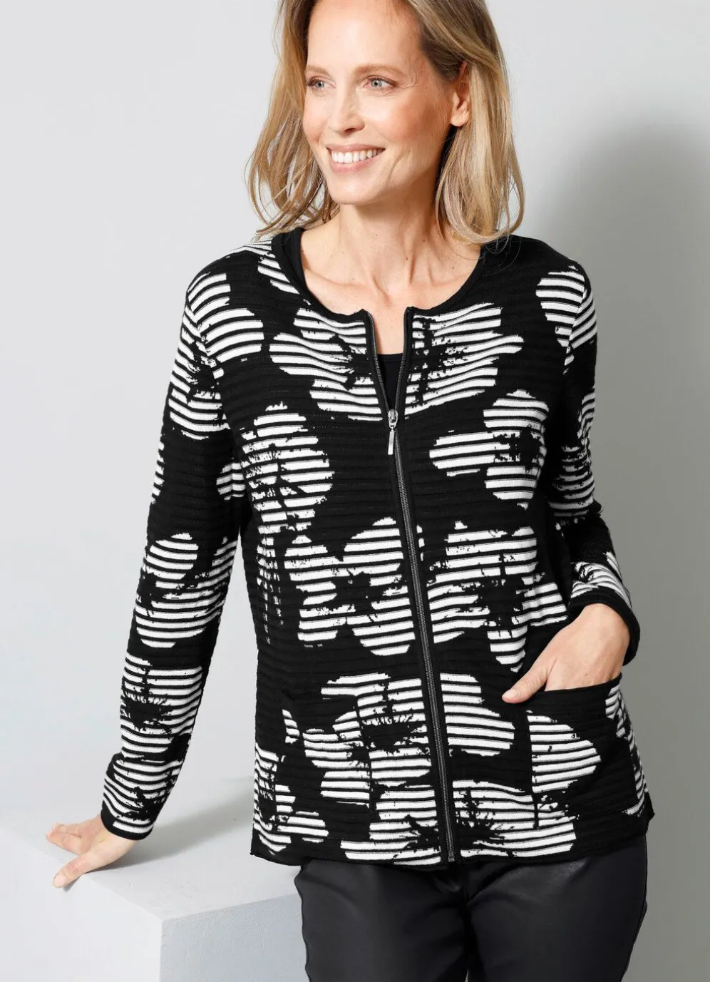 Strickjacke: Rundhals, durchgehender Reissverschluss, lange Ärmel und Saum und 2 aufgesetzte Taschen mit Rollkanten, florale Jacquard-Elemente, Strukturstreifendessin.