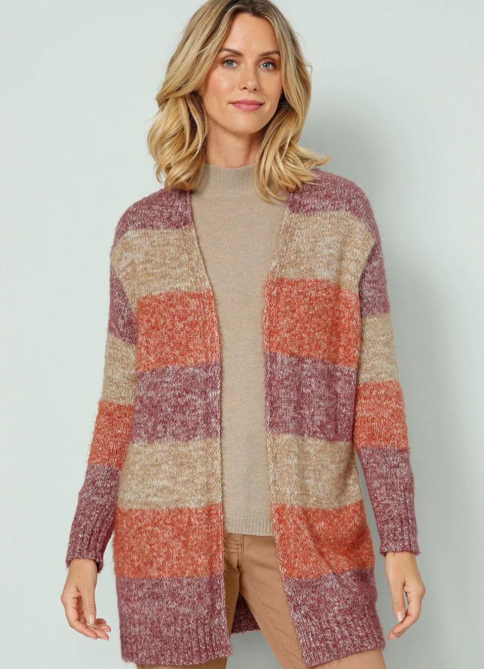 Strickjacke: verschlusslos, Rippenabschlüsse an langen Ärmeln und Saum, Blockringel in Garnmix mit Langhaar- und Feinbouclé-Effektgarnen sowie Melange-Effekten.