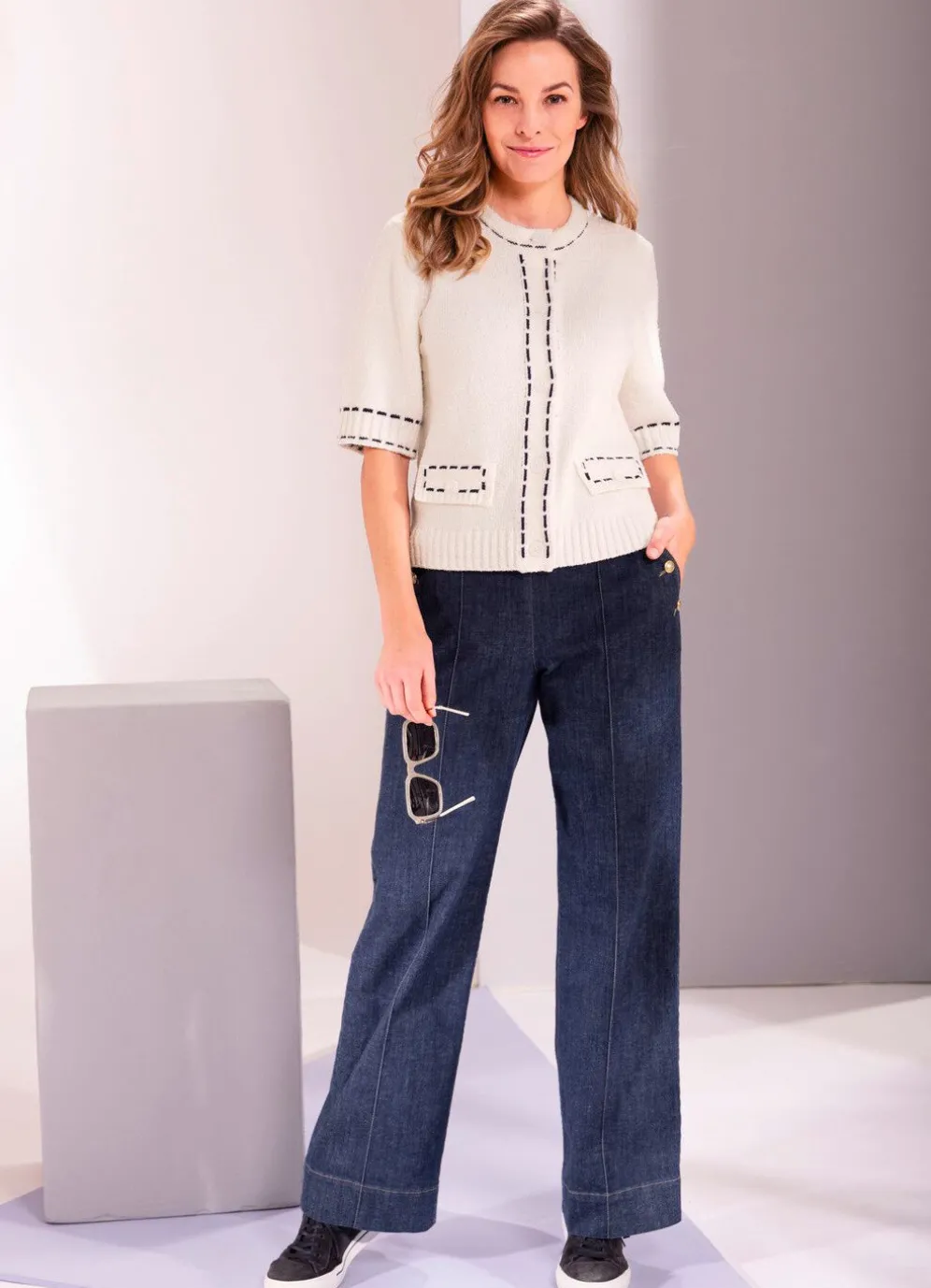 Entzückende, cremefarbene Strickjacke von B/ANCA, mit rundem Halsausschnitt, durchgeknöpft, halbarm, Zierpatten mit Zierknöpfe im Vorderteil sowie hübsche, marinefarbene Kontraste.
