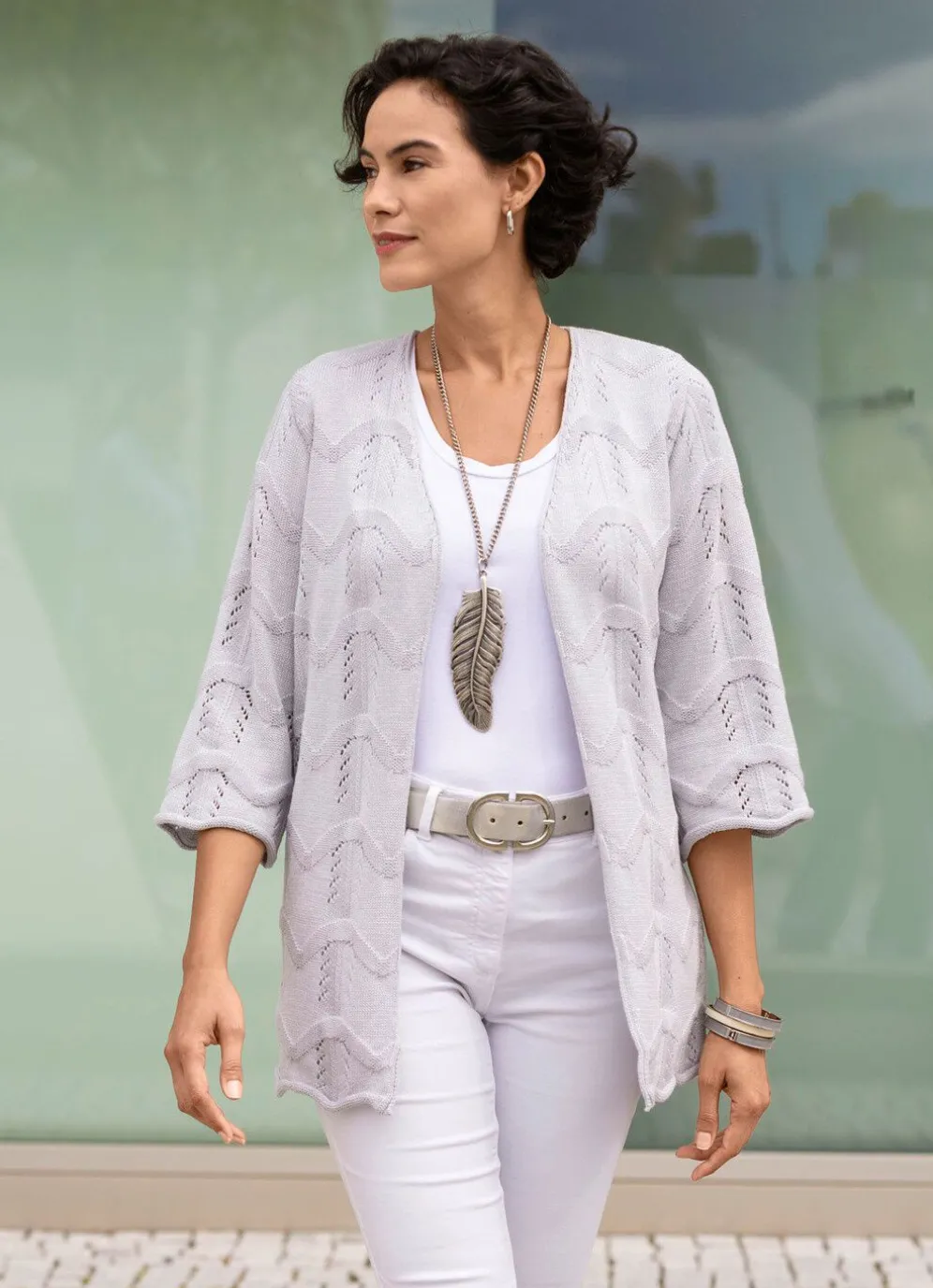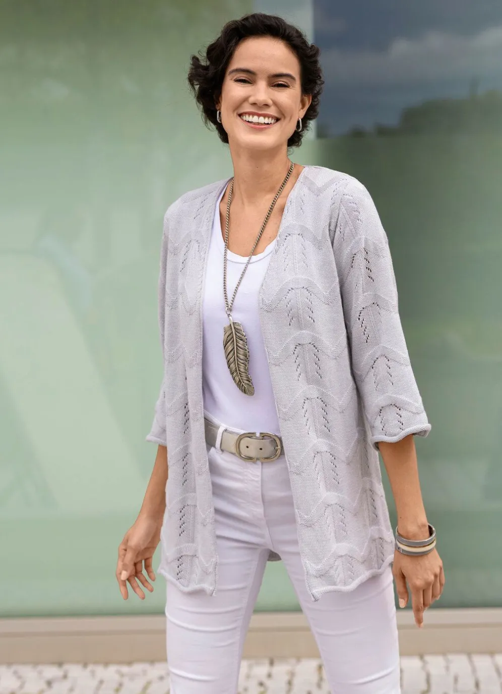 Strickjacke mit V-Ausschnitt, Ajour- und Strukturmix im Wellendessin allover, etwas weiteren Ärmeln in modischer Länge sowie dekorativen Rollkantenabschlüssen an den Ärmeln und am Saum.
