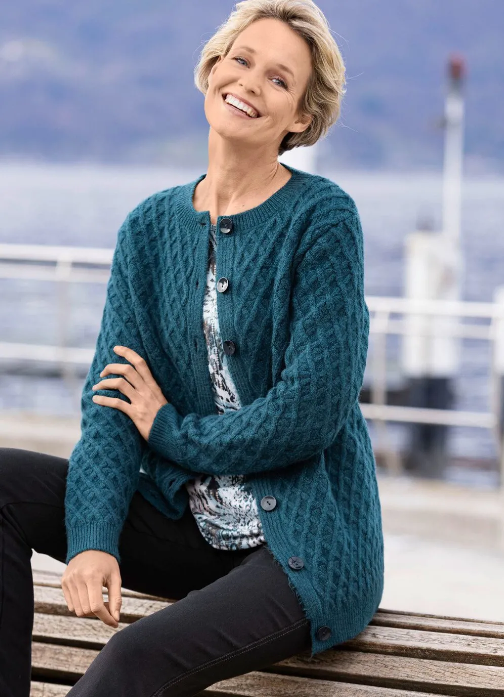 Durchgeknöpfte Strickjacke in Petrol, mitrundem Halsausschnitt, Strukturstrick im Rautendessinallover, langen Ärmeln sowie geripptenAbschlüssen. Länge ab ca. 68 cm. Die Qualität:76% Polyacryl und 24% Polyester