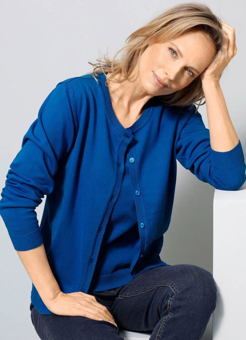 Aparte Strickjacke in durchgeknöpfter, leicht taillierter Form, mit rundem Halsausschnitt sowie Rippenbündchen an den langen Ärmeln.