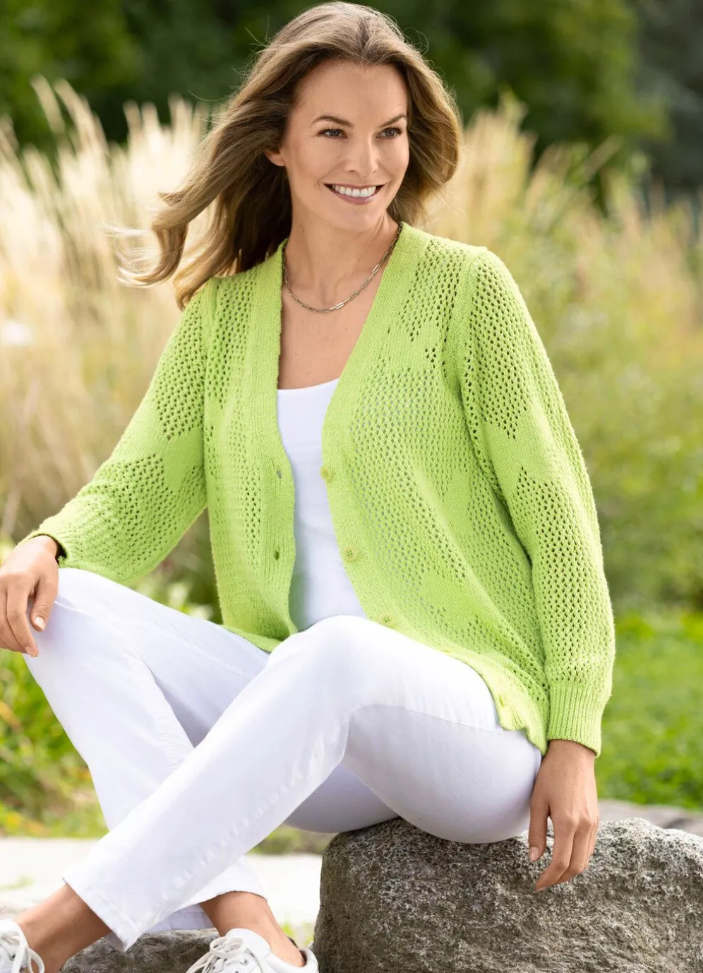 Ein absolutes Lieblingsstück ist diese durchgeknöpfte, limettenfarbene Strickjacke von laurakent, mit V-Ausschnitt, Ajourmuster allover, zusätzlichen Schmetterlingsmotiven im Vorderteil und an den langen Ärmeln sowie gerippten Abschlüssen.