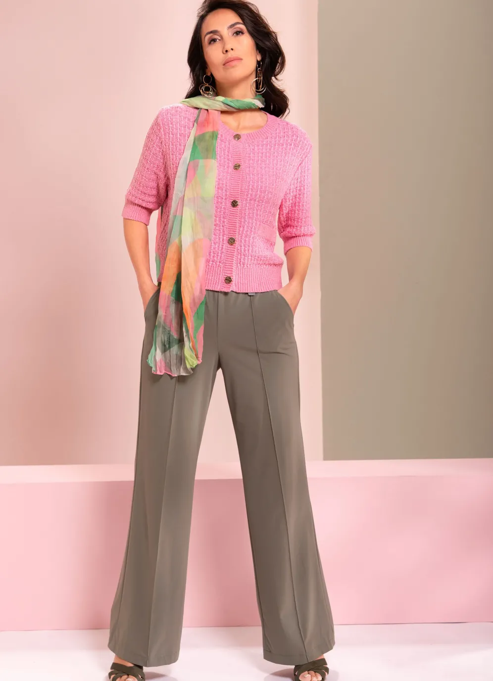 Zauberhafte, orchideefarbene Strickjacke von B/ANCA in durchgeknöpfter Form, mit hübschem Strukturmuster allover, rundem Halsausschnitt, schönen Schmuckknöpfen sowie kurzen Ärmeln und Zierpatten im Vorderteil.