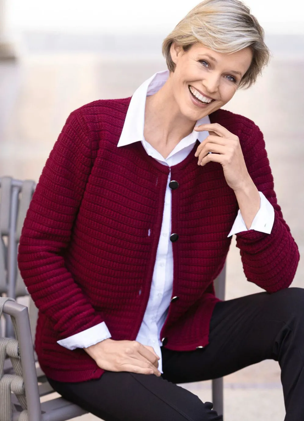 Durchgeknöpfte Strickjacke mit rundem Halsausschnitt, Strukturstrick in Streifendessin allover, aufgesetzten Taschen sowie gerippten Abschlüssen an den langen Ärmeln und am Saum.