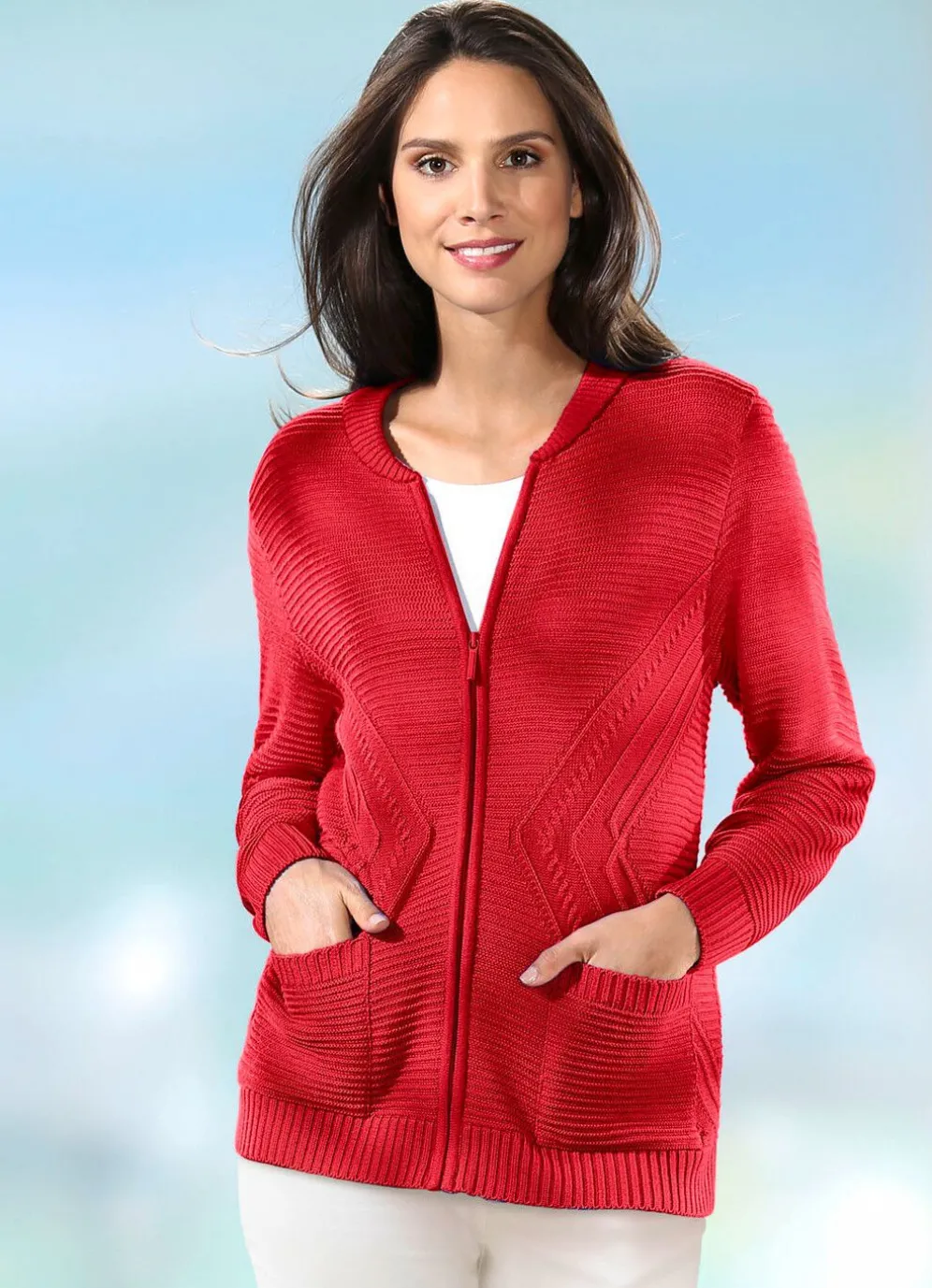 Diese herrliche Strickjacke ist ein perfekter Begleiter für jeden Tag! Mit geripptem Halsausschnitt, durchgehendem Reißverschluss, Zackenmuster im Vorderteil, langen Ärmeln, zwei aufgesetzten Taschen.