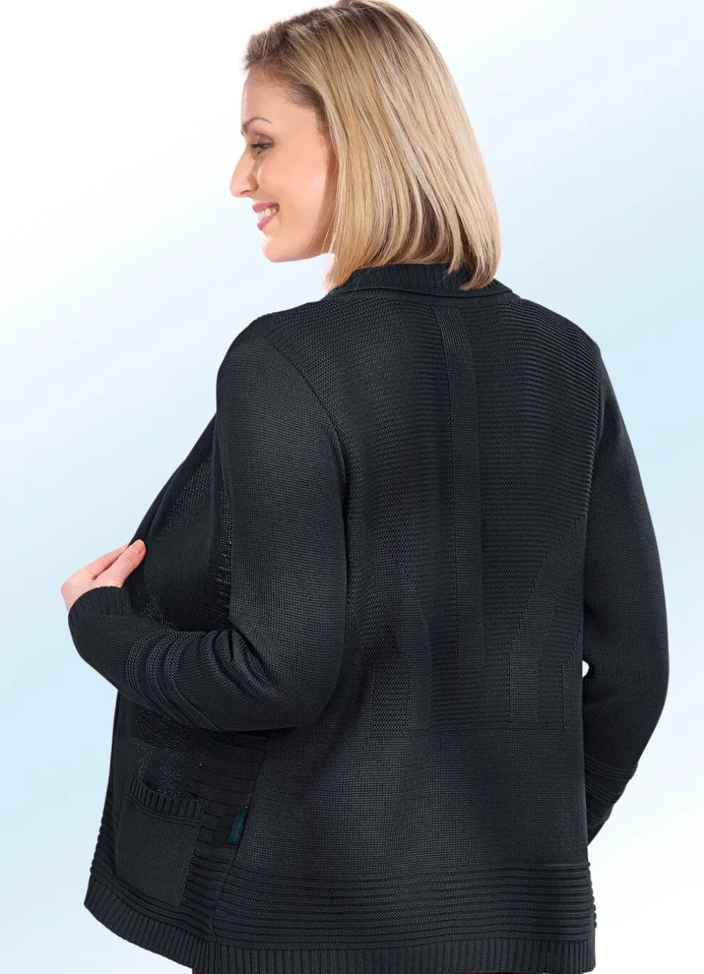 Ausgezeichnete Strickjacke, mit Stehbund und Bindeband, durchgehendem Reißverschluss, zwei kleinen Taschen, langen Ärmeln sowie Strukturmuster im Vorder- und Rückteil.