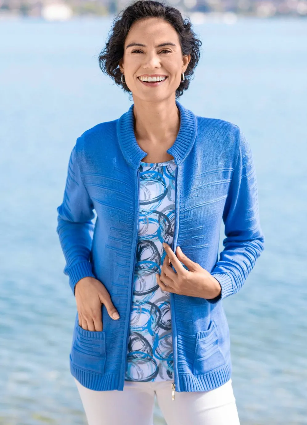 Schöne Strickjacke mit Strukturmuster in Streifenoptik an den langen Ärmeln, im Vorderteil und den zwei aufgesetzten Taschen, Stehbund, verdecktem Reißverschluss sowie gerippten Abschlüssen.