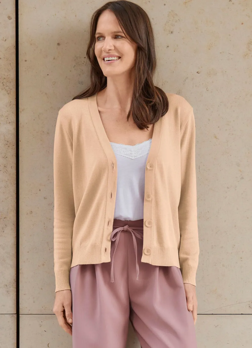Ein absoluter Kuschelfavorit ist diese durchgeknöpfte Strickjacke von STILSCHMIEDE, mit supersoftem Griff in edel schimmernder Qualität, V-Aussschnitt sowie Rippenbündchen an den Abschlüssen der langen Ärmel und am Saum.