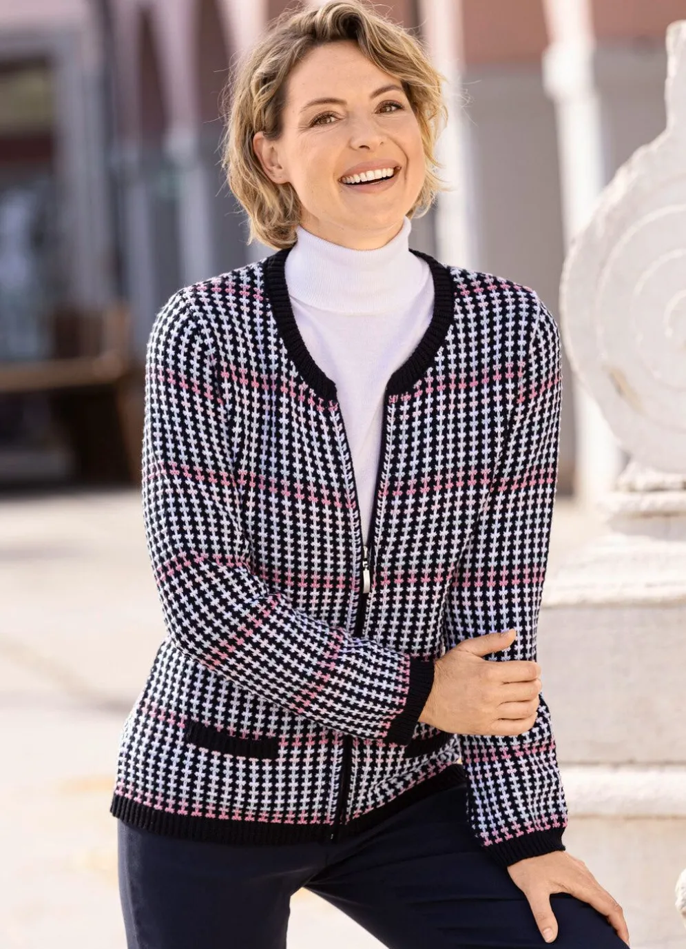 Ein Liebhaberstück ist diese effektvolle Strickjacke mit zartem Farbverlauf in Marine-Rosa-Multicolor, eindrucksvollem Strukturmuster allover, rundem Halsausschnitt, Zierpatten im Vorderteil, langen Ärmeln, verdecktem Reißverschluss sowie gerippten Abschlüssen.