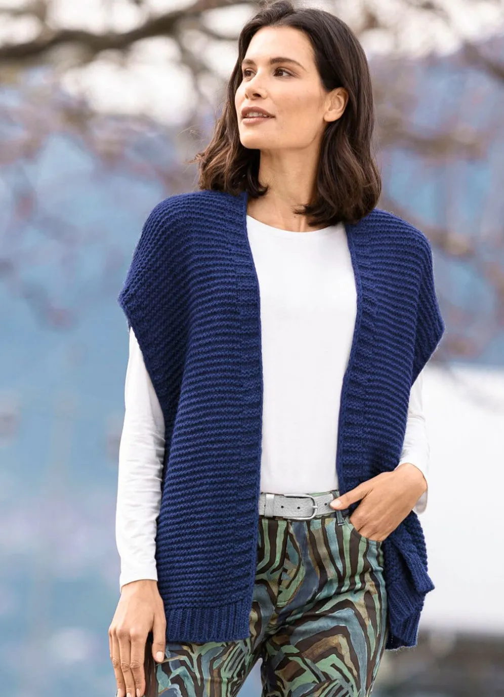 Figurschmeichelnde Strickweste: dezent dessinierte, verschlusslose V-Blende und Armausschnitte, Biesenstrick rundum sowie Rippensaum.