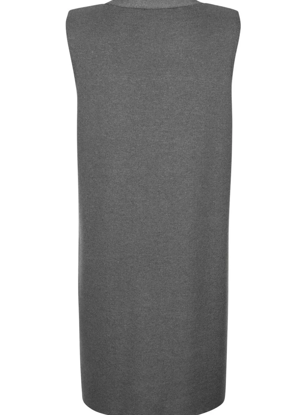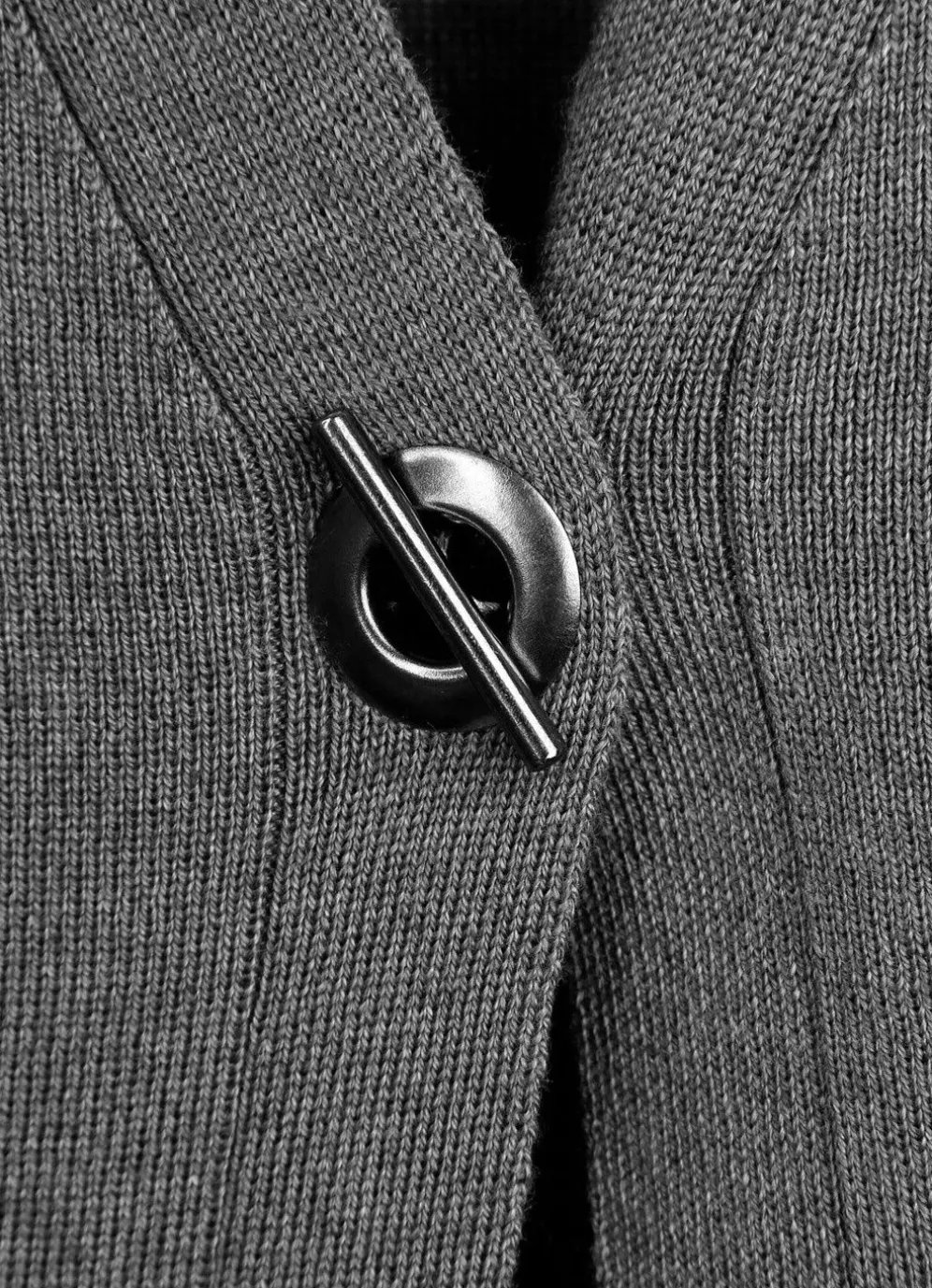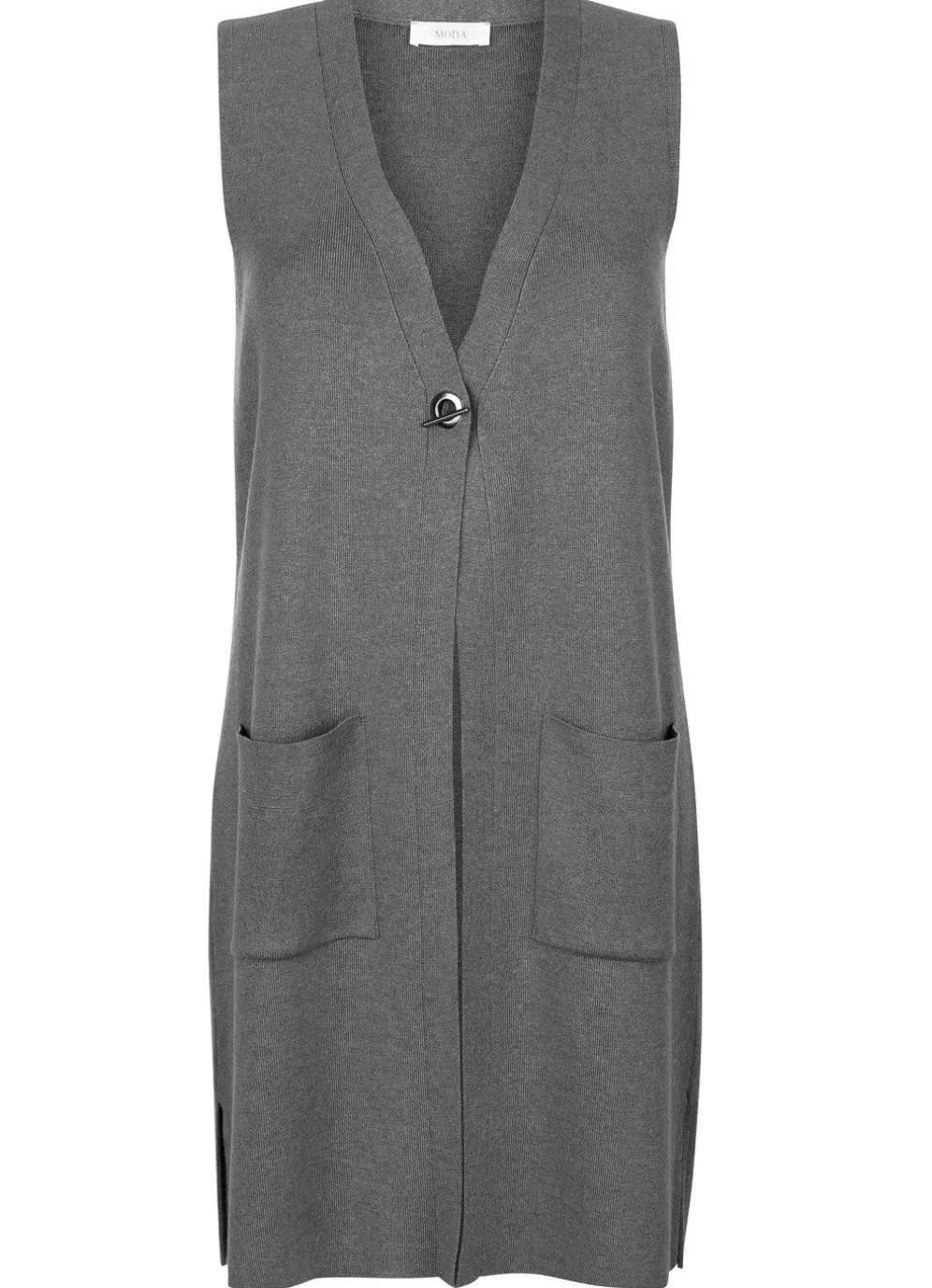 Tolle Strickweste in Longform mit V-Ausschnitt, dekorativem Verschluss, 2 aufgesetzten Taschen sowie Seitenschlitzen.