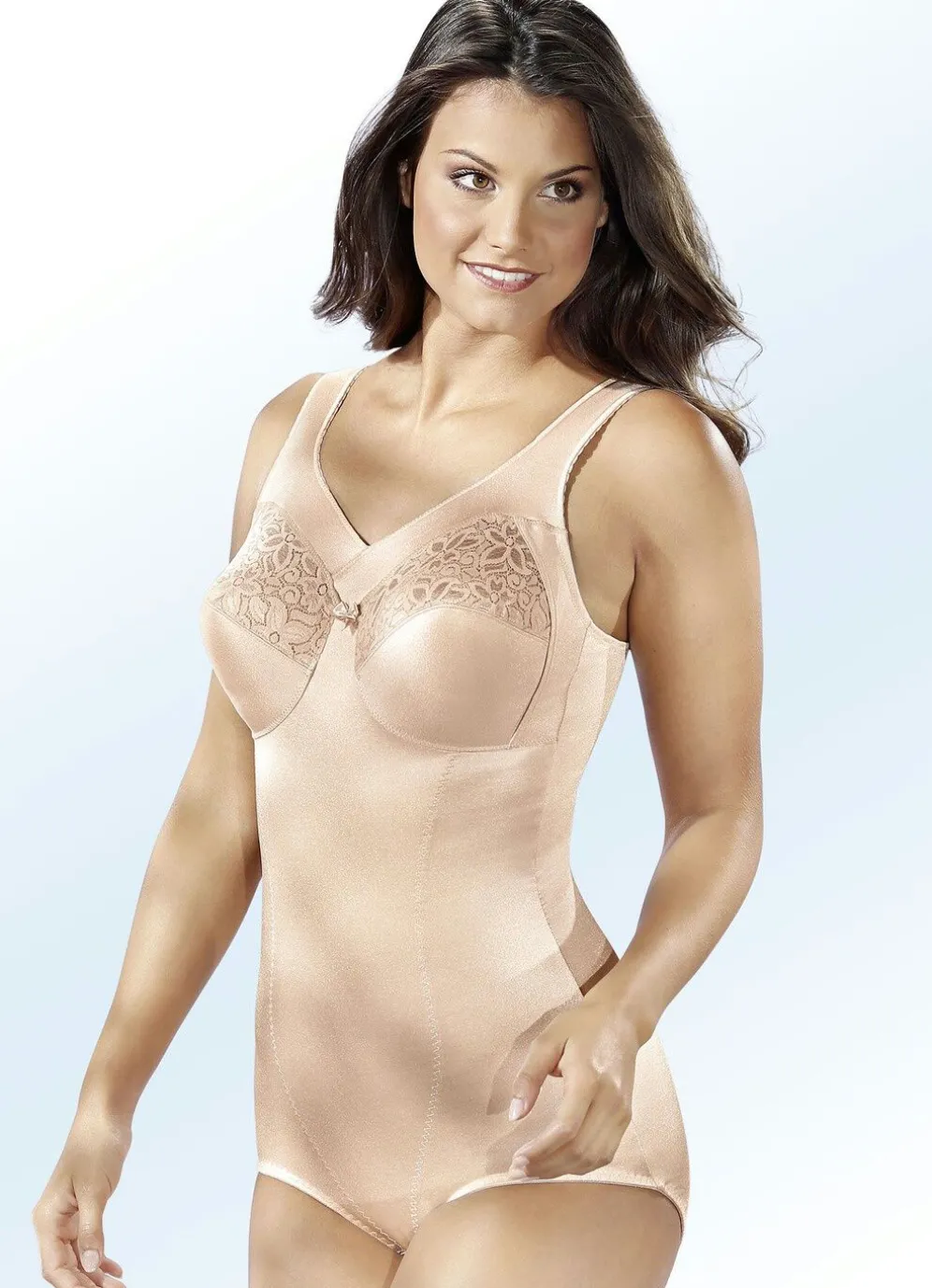 „Susa“-Hosenkorselett mit floraler Elastikspitze in den unterlegten Cups, gepolsterter Unterbruststütze, Verstärkung im Vorderteil, im Schulterbereich weich gepolsterten, verstellbaren Stretchträgern sowie Hakenverschluss und Baumwolleinlage im Schritt.