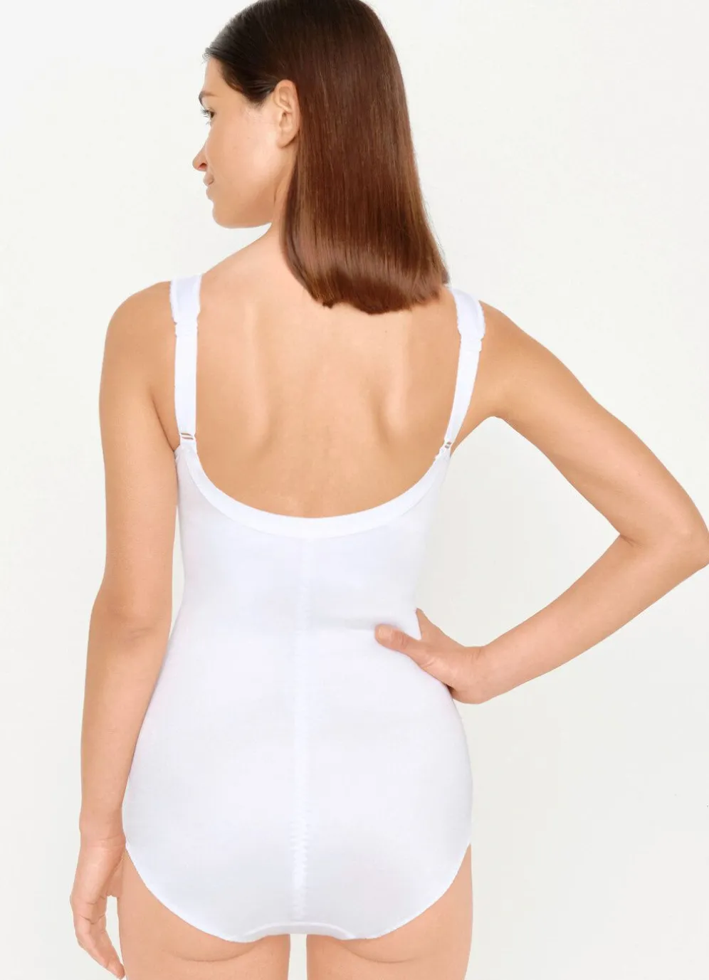 „Susa“-Hosenkorselett mit floraler Elastikspitze in den unterlegten Cups, gepolsterter Unterbruststütze, Verstärkung im Vorderteil, im Schulterbereich weich gepolsterten, verstellbaren Stretchträgern sowie Hakenverschluss und Baumwolleinlage im Schritt.