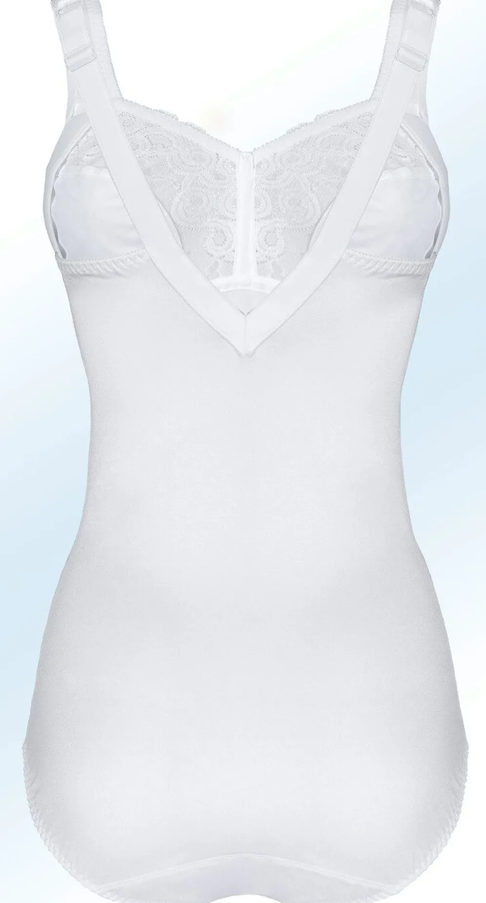 Hosenkorselett von „Swegmark of Sweden“, mit Elastikspitzeneinsätzen im Vorderteil, unterlegten Untercups, seitlicher, weich gepolsterter Cupverstärkung, verstärkter Bauchpartie, im Schulterbereich weich gepolsterten, verstellbaren Stretchträgern, rückwärtigem V-Ausschnitt sowie Hakenverschluss und Baumwolleinlage im Schritt.