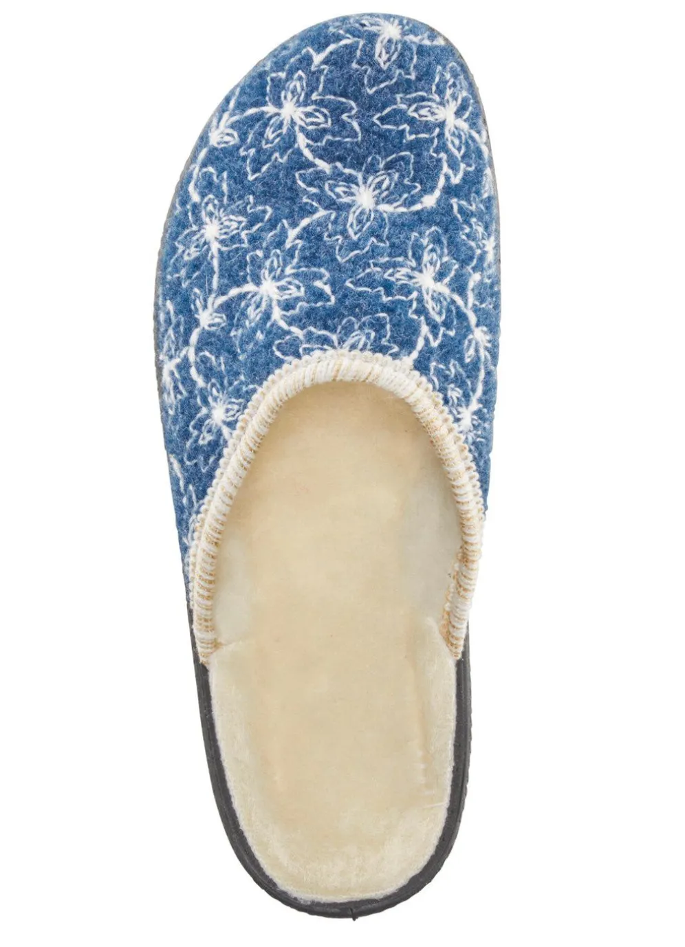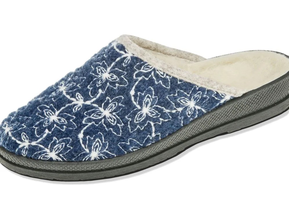 Textil-Pantoffel mit wollweißer Stickerei: Warmfutter und Fußbettbezug aus reiner Schurwolle, leichte PVC-Laufsohle sowie 20 mm Keilabsatz