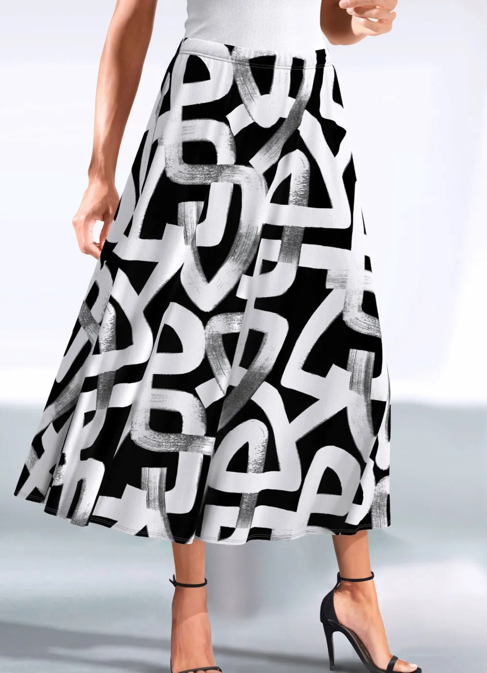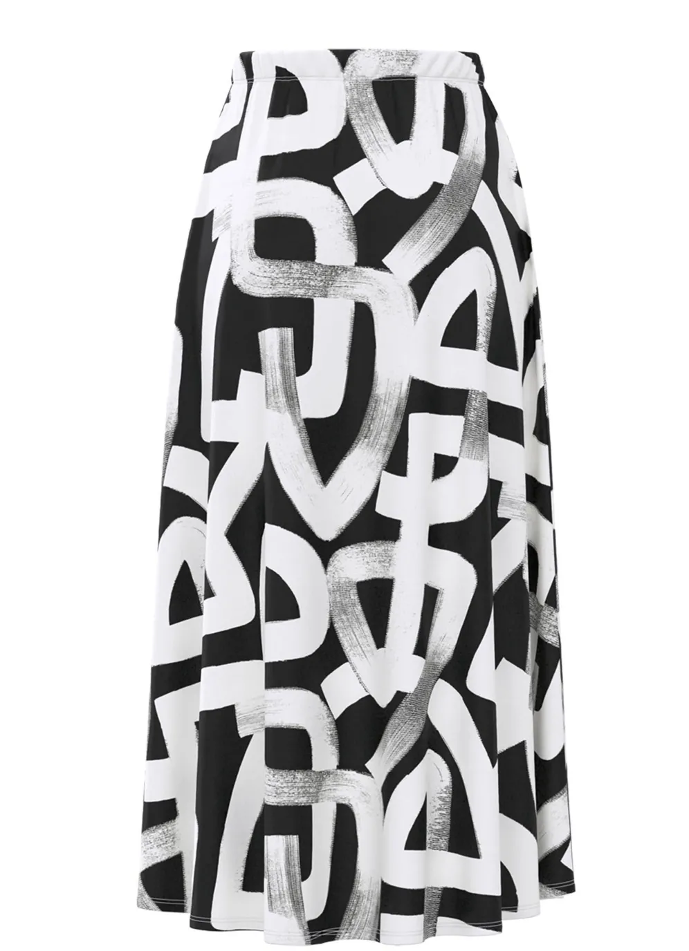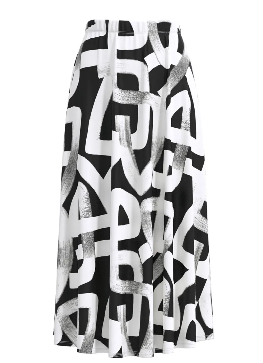 in Schwarz-Weiß in bequemer Schlupfform mit schmalem Dehnbund rundum. Die leichte Tellerform verleiht diesem Modell seine duftige Weite. Gesamtlänge ca. 80 cm, bei K-Gr. ca. 74 cm.