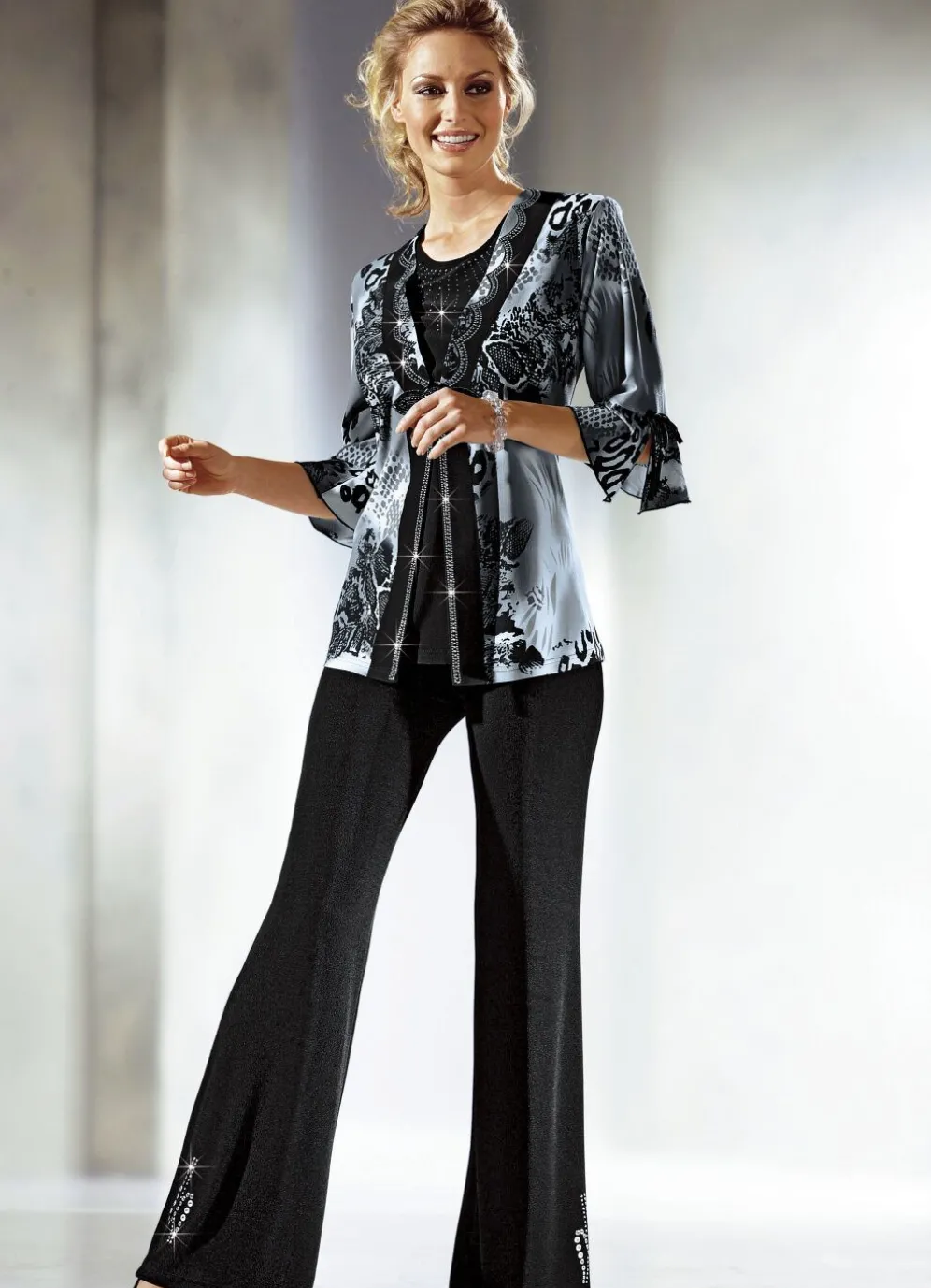 Aufwendig gearbeitete Party-Tunika in Grau-Schwarz-Weiß: stilvolle 2-in-1-Optik, Schulterpolster, effektvoll funkelnde Strass- und Schmucksteinzier entlang der Blende mit herrlicher Broschen-Applikation, schwarzer Top-Einsatz mit rundem Halsausschnitt und Schmucksteinchen, Zierbändchen und Schlitz an den Volant-Abschlüssen der 3/4-langen Ärmel sowie Seitenschlitze.