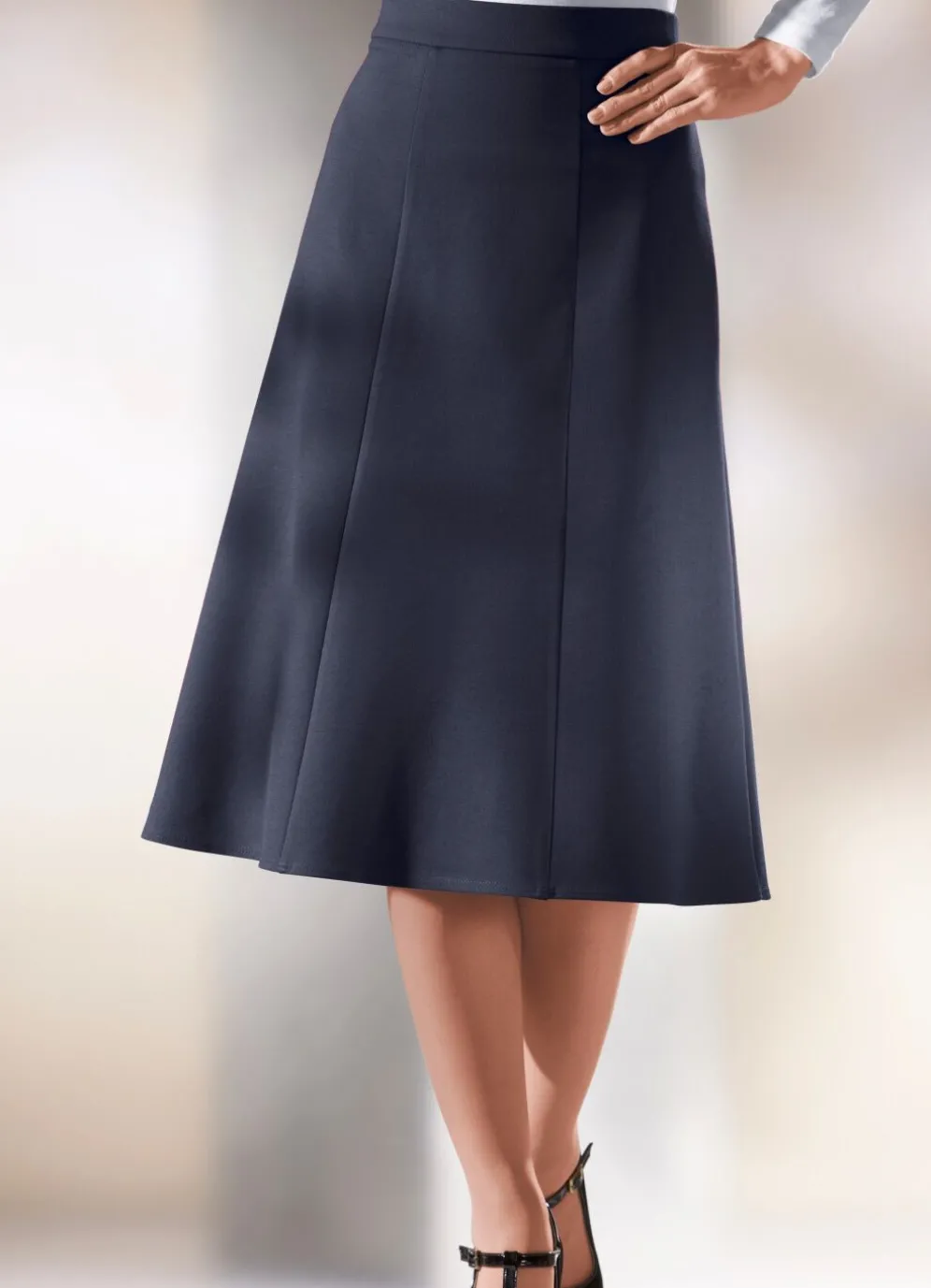 Mit sportivem Chic präsentiert sich dieser tragangenehme, lange 6-Bahnenrock in schicker A-Linie: bequeme Schlupfform, glatt anliegend dank des innen liegenden, unsichtbaren Rundum-Dehnbundes, nach unten hin in leicht ausgestellter Form. Länge ab Taille ca. 68 cm, bei K-Gr. ca. 64 cm.
