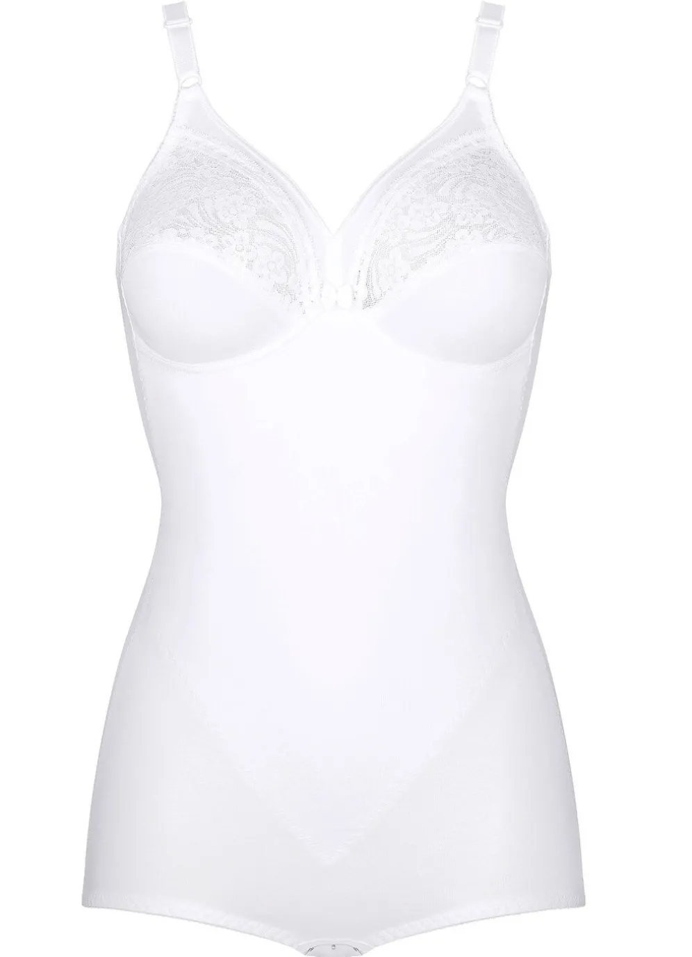 „Triumph“-Hosenkorselett mit Baumwollspitze in den Obercups, Verstärkung vorne, verstellbaren Stretchträgern sowie Hakenverschluss und Baumwolleinlage im Schritt.