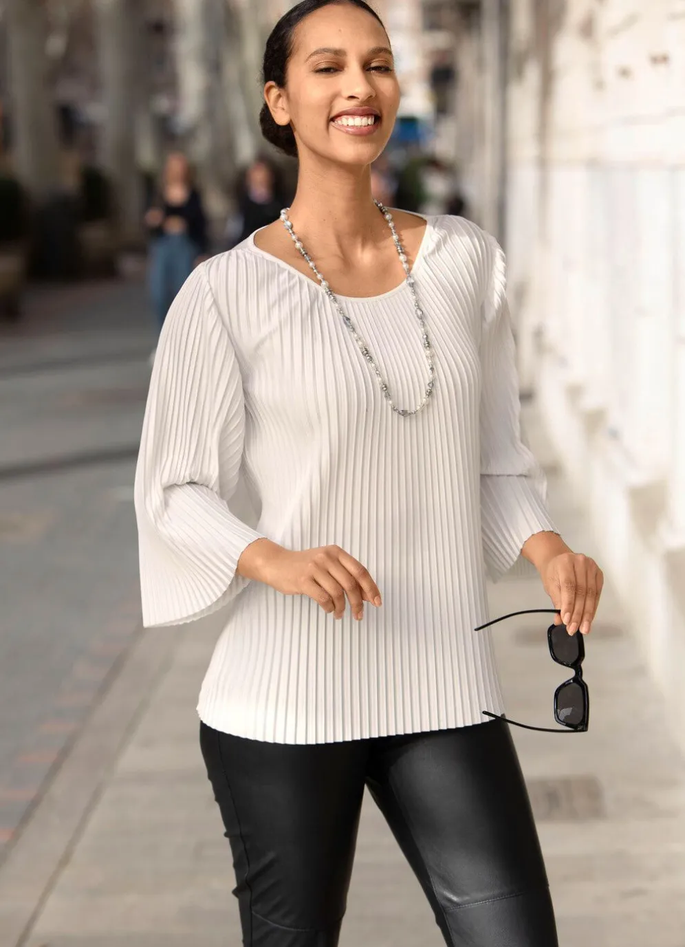 Modische Tunika mit rundem Halsausschnitt sowie duftigem Plissee im Vorderteil und an den 3/4-langen Ärmeln. Rückteil aus Elastik-Jersey.