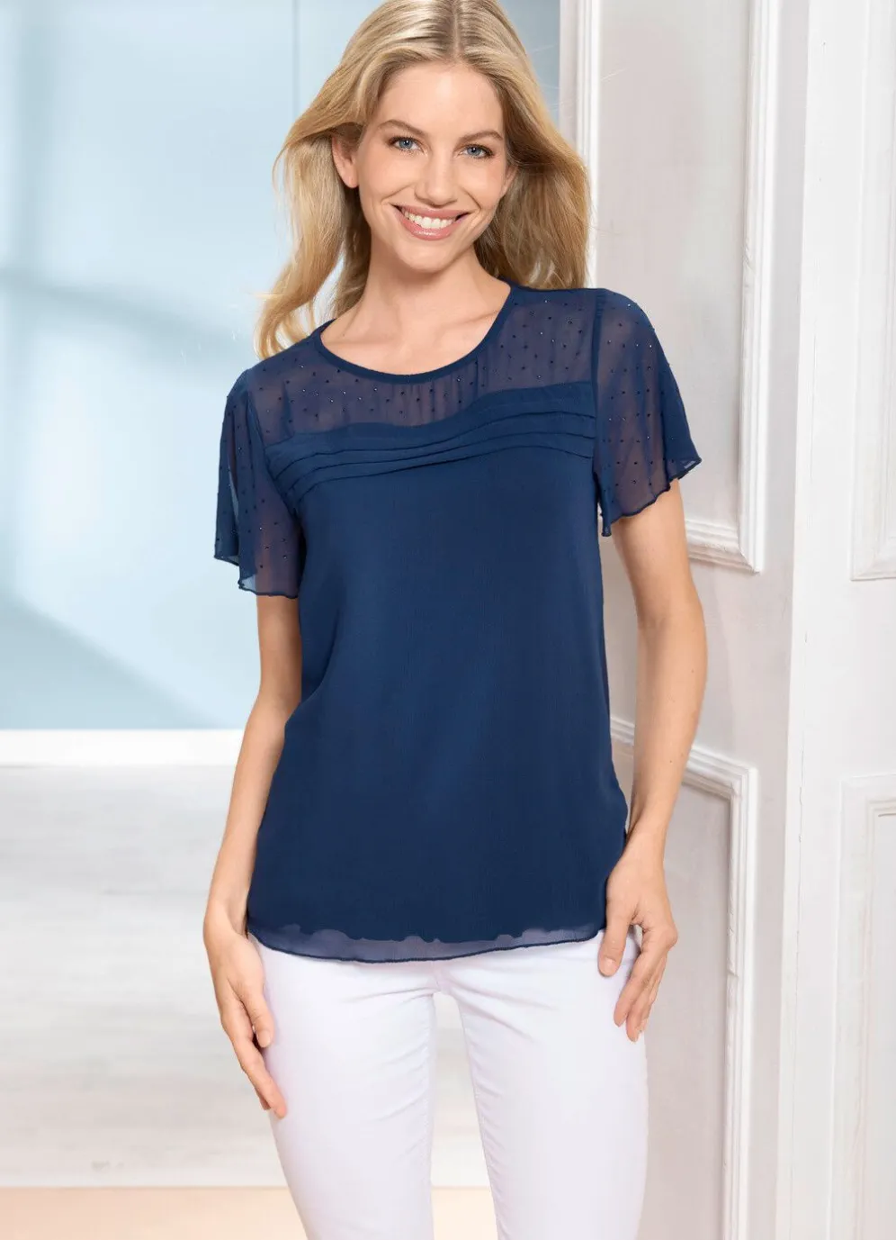 Faszinierende, nachtblaue Tunika in tollem Lagenlook durch transparenten Chiffon-Besatz mit hübscher Biesenzier im Vorderteil, mit rundem Halsausschnitt, transparenter Vorderpasse, kurzen, mit funkelnden Strasssteinen besetzten Flügelärmeln sowie gekräuseltem Saum am Jersey rundum.