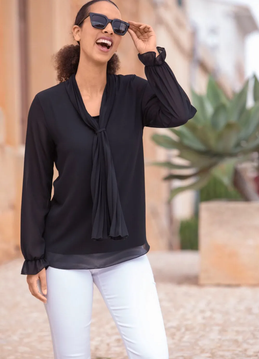 Unterlegte Tunika mit plissierter Bindeschluppe, rundem Halsausschnitt sowie duftig transparenten langen Ärmeln mit elastisch gesmokten Abschlüssen.