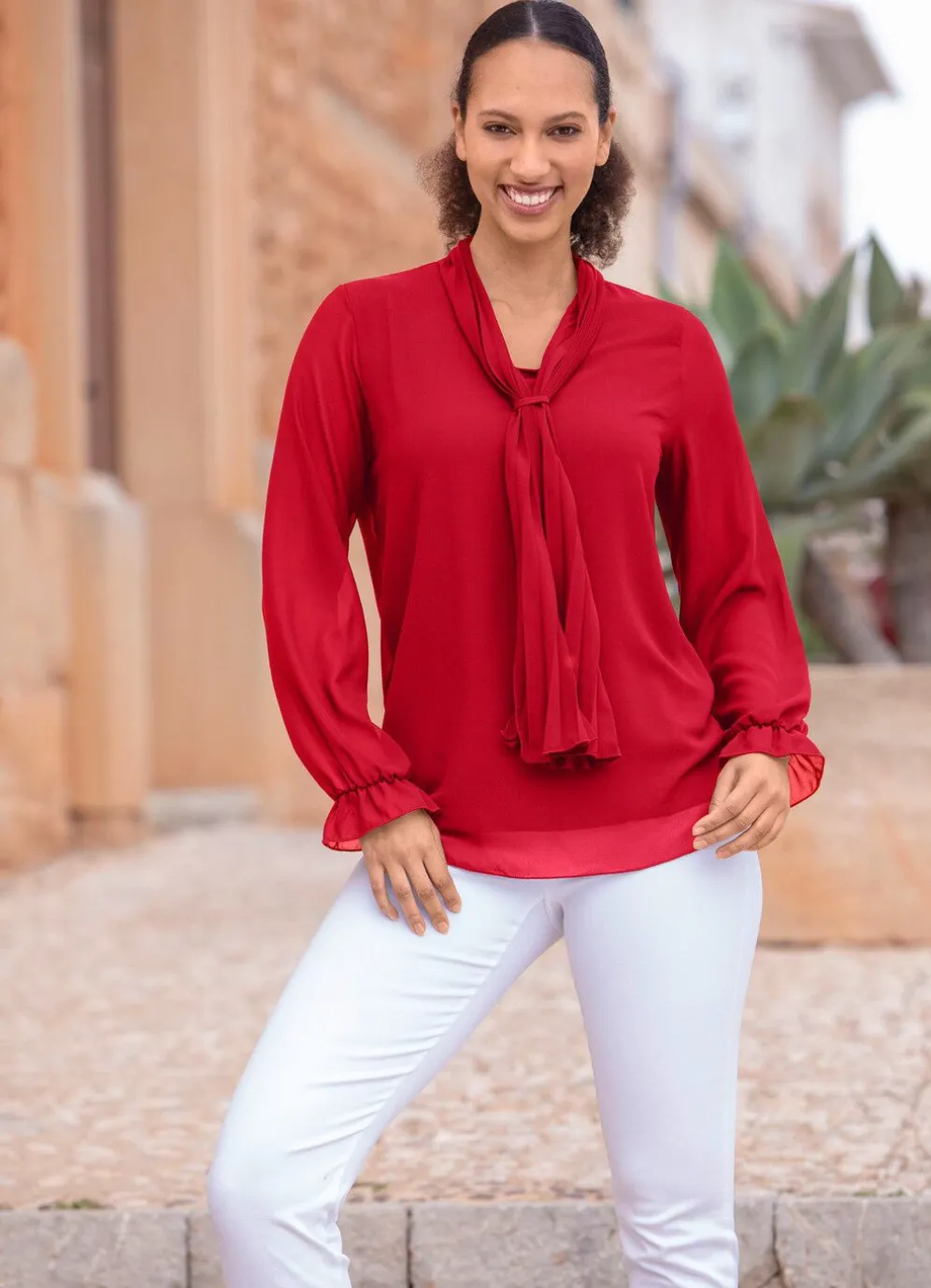 Unterlegte Tunika mit plissierter Bindeschluppe, rundem Halsausschnitt sowie duftig transparenten langen Ärmeln mit elastisch gesmokten Abschlüssen.