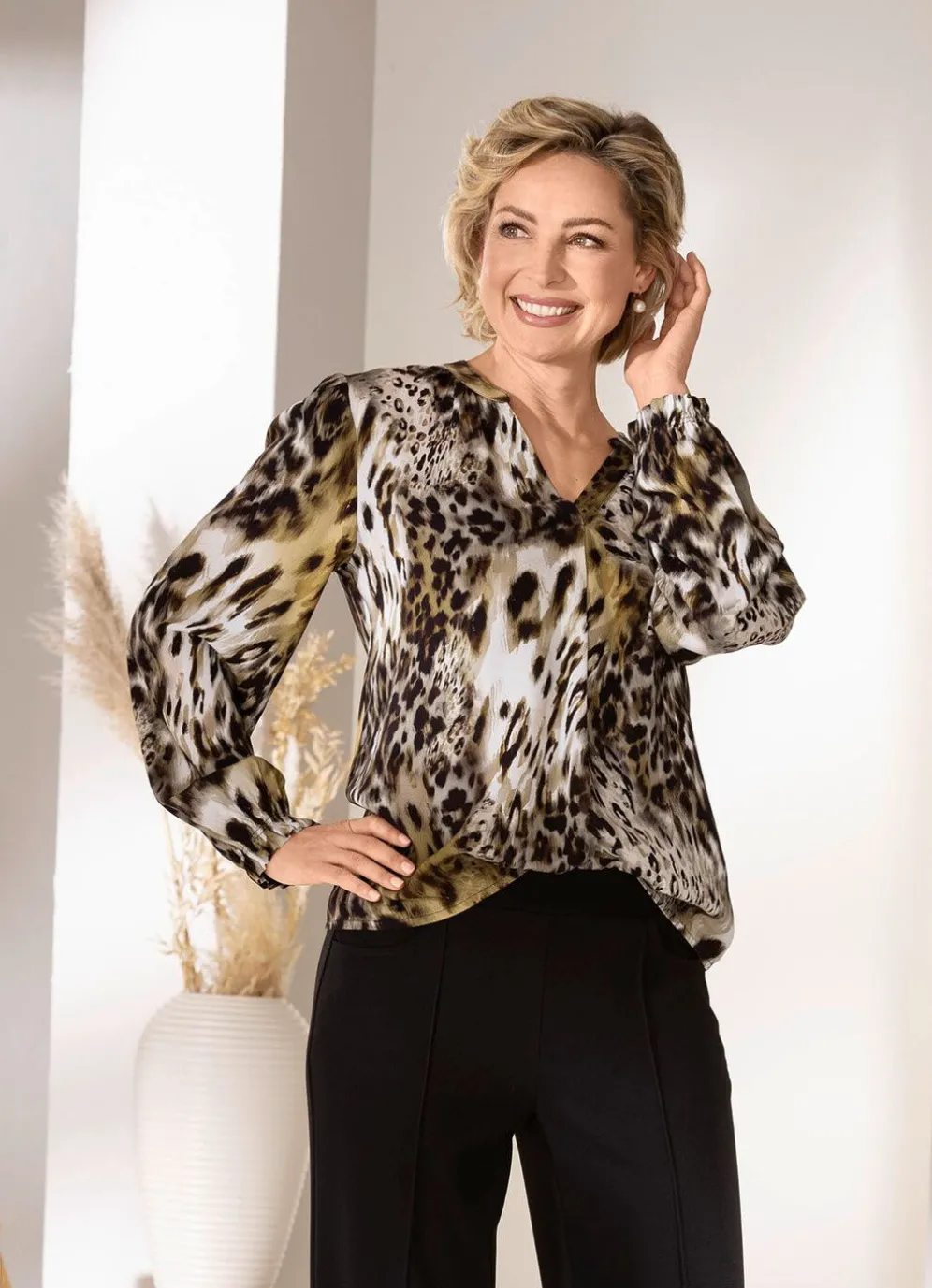 Flotte Tunika mit farbbrillantem Druck in Schwarz-Khaki-Ecru-Bunt, Stehkragen am V-Ausschnitt, langen Ärmeln mit elastisch gesmokten Abschlüssen, Faltenlegung im Vorder- und Rückteil sowie länger geschnittenem Rückteil.