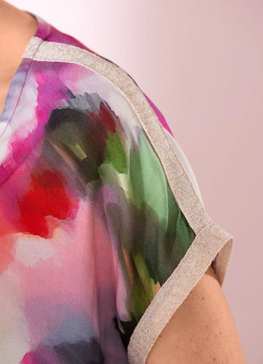 Jedes Teil ein Unikat! Hübsche Tunika in Beere-Fuchsia-Rot-Bunt, mit rundem Halsausschnitt, glänzendem Bändchen an der Schulternaht und an den Abschlüssen der kurzen, überschnittenen Ärmel sowie elastischem Saumabschluss rundum.