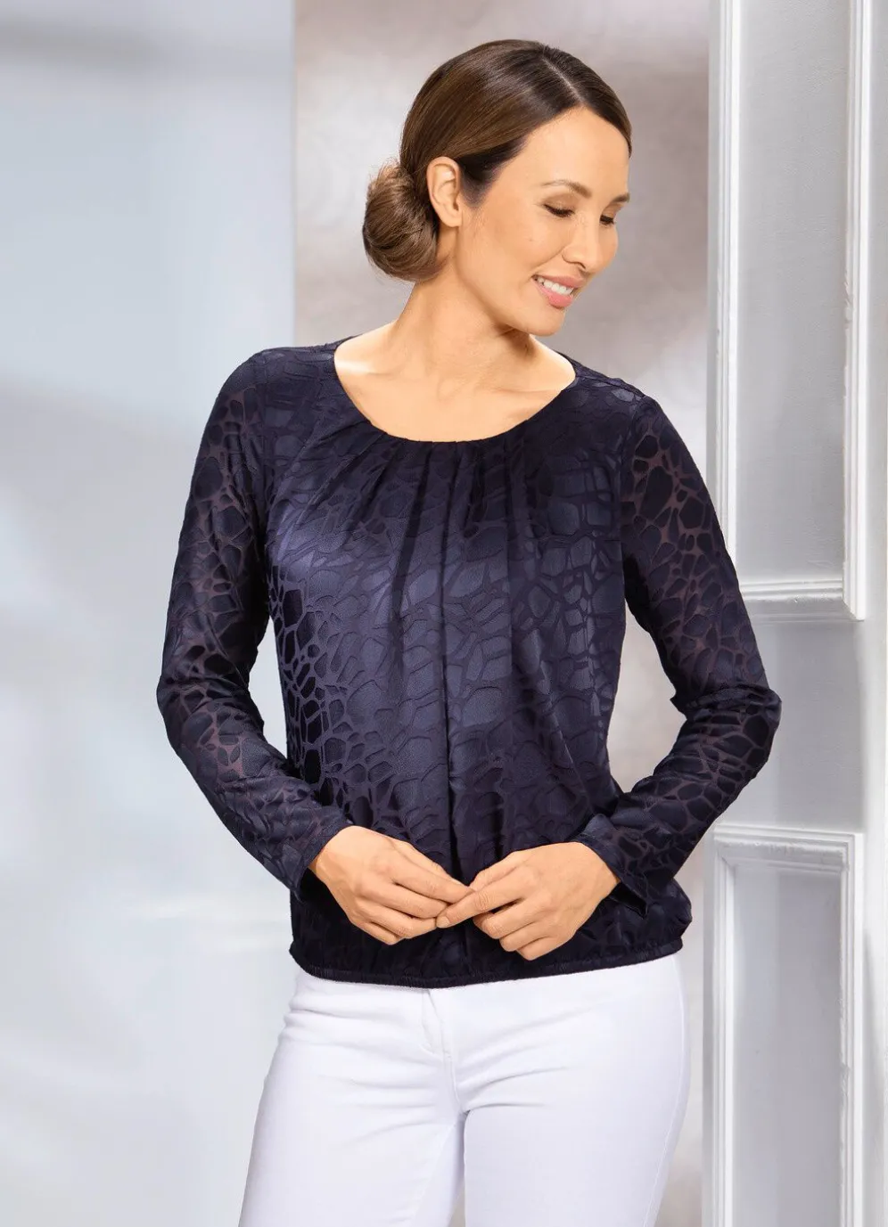 Elegante, unterlegte Tunika in Nachtblau, mit hübscher Fältelung am runden Halsausschnitt, duftig transparenten langen Ärmeln sowie elastischem Saumabschluss rundum.