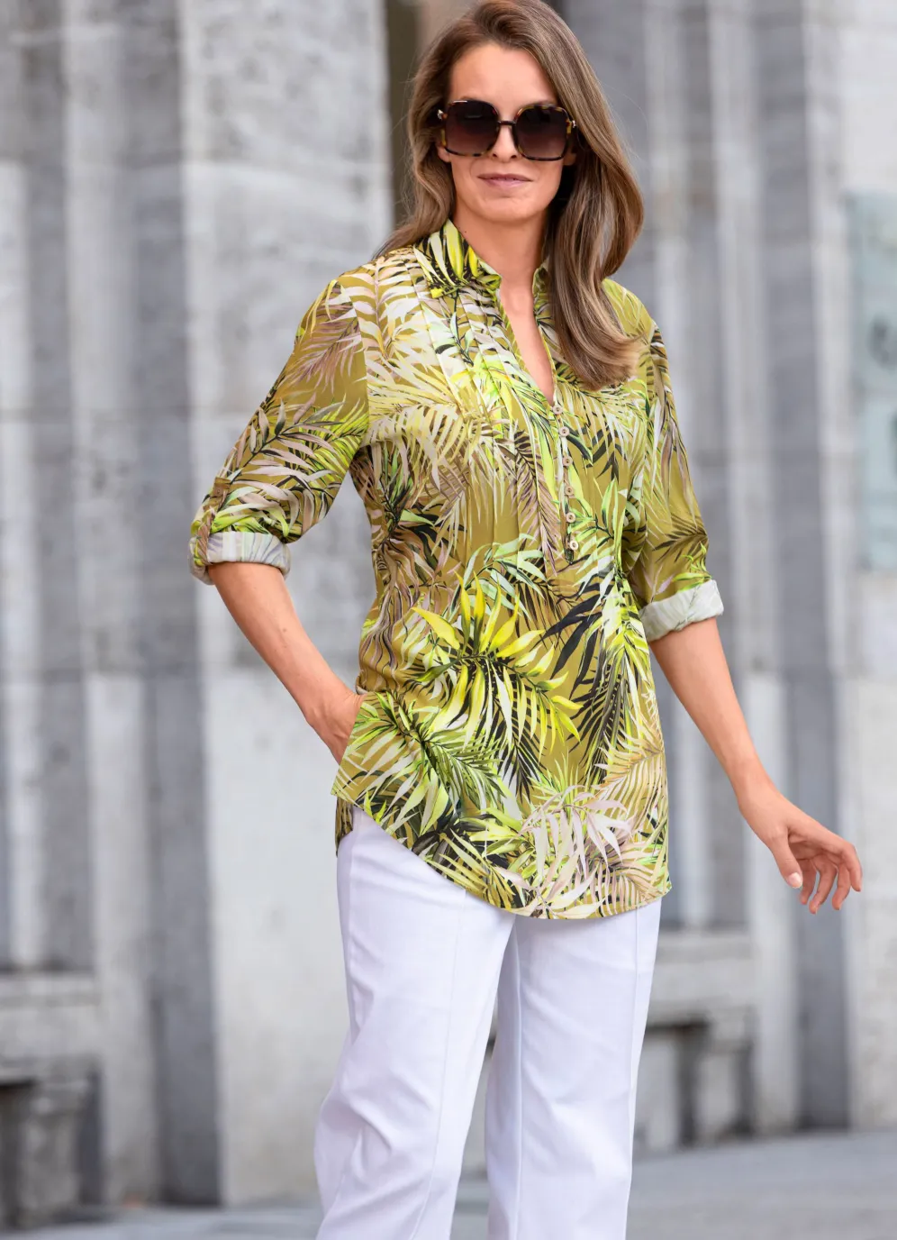 Feminine Tunika von TIZIA in Oliv-Kiwi-Grün-Bunt, mit V-Ausschnitt und kurzer Schlingenknopfleiste an der offenen Kragenlösung, toller Biesenzier im Vorderteil mit aufspringenden Fältchen, schmaler Manschette an den durch Riegel und Knopf auf 1/2-Arm-Länge krempelbaren, 3/4-langen Ärmeln sowie Seitenschlitzen.