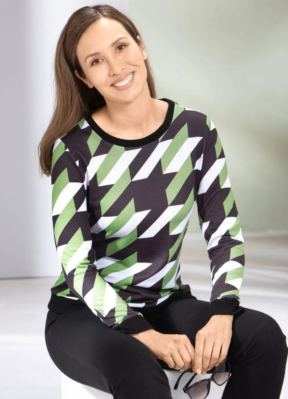 Flotte Tunika mit farbbrillantem Druck in Pistazie-Weiß-Schwarz, dekorativem, schwarzen Rippenstrick am runden Halsauschnitt, an den Abschlüssen der langen Ärmel sowie am Saumabschluss rundum.