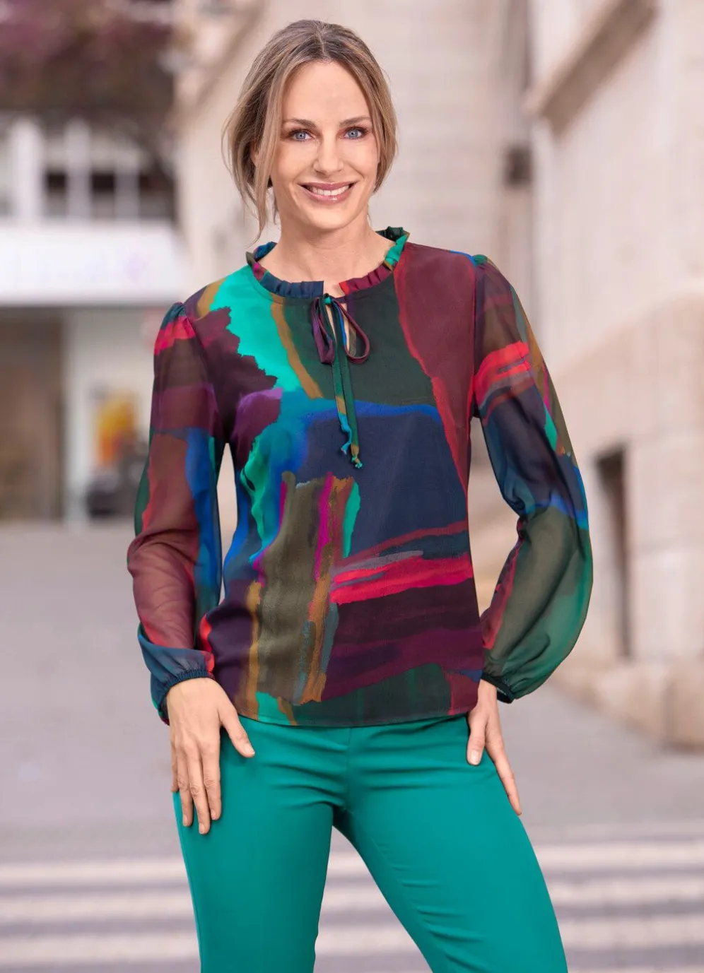 Jedes Teil ein Unikat! Farbenfrohe Tunika von TIZIA mit kurzem Schlitz und Bindebändchen am Rüschenkragen, duftig, transparente lange Ärmel mit elastischen Abschlüssen.