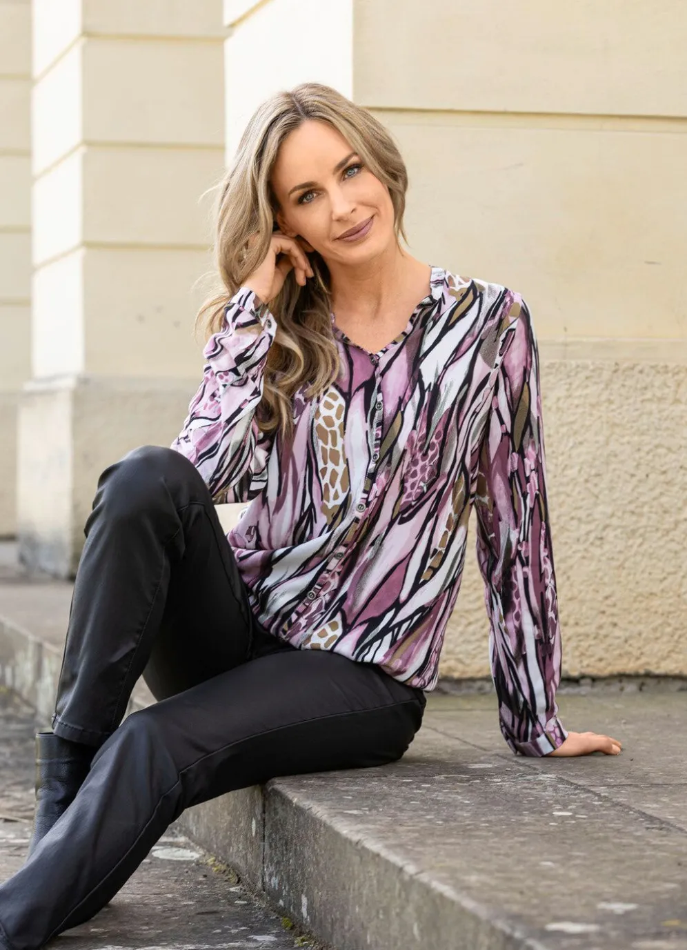 Schöne Tunika mit farbbrillantem Druck in Rosé-Ecru-Schwarz-Bunt, V-Ausschnitt am Stehkragen, Schmuckknöpfen im Vorderteil, langen Ärmeln mit schmalen Manschetten sowie elastischem Saumabschluss rundum.