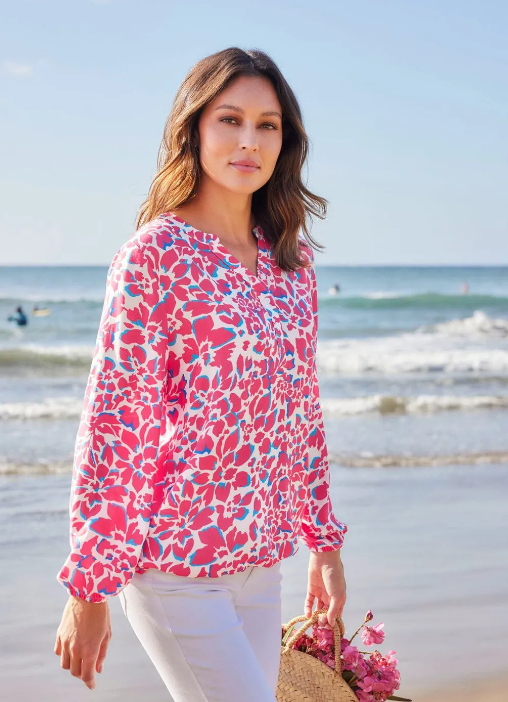 Trendgenaue Tunika in Koralle-Ecru-Blau-Bunt von laurakent: kurze Knopfleiste am Stehkragen, elastische Abschlüsse an den langen Ärmeln sowie am Saumabschluss rundum.