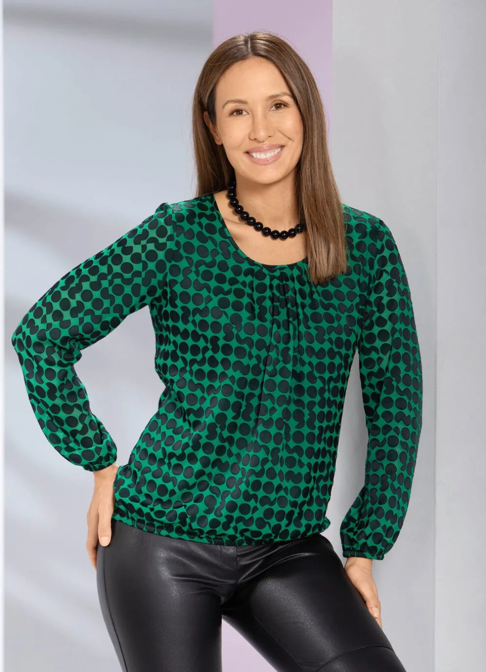 Schicke, unterlegte, grün-schwarze Tunika mit Tupfen und gefälteltem, rundem Halsausschnitt, transparenten, langen Ärmeln mit elastischen Abschlüssen sowie elastischem Saumabschluss rundum.
