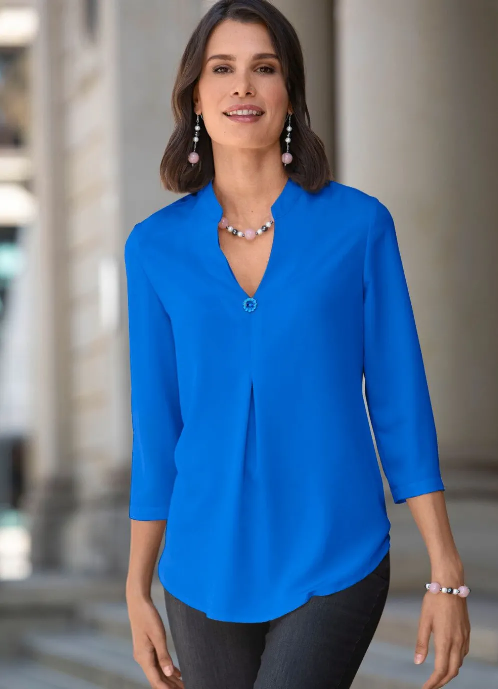 Schöne Tunika mit Schmuckbrosche am V-Ausschnitt, 3/4-langen Ärmeln, Rückenpasse mit Kellerfalte sowie länger geschnittenem Rückteil.