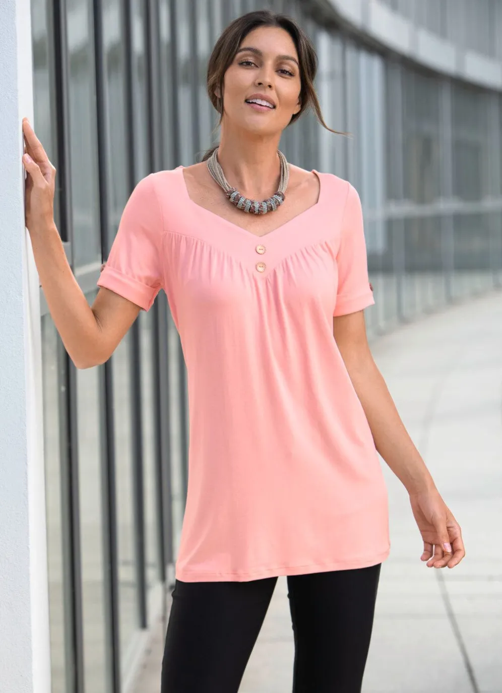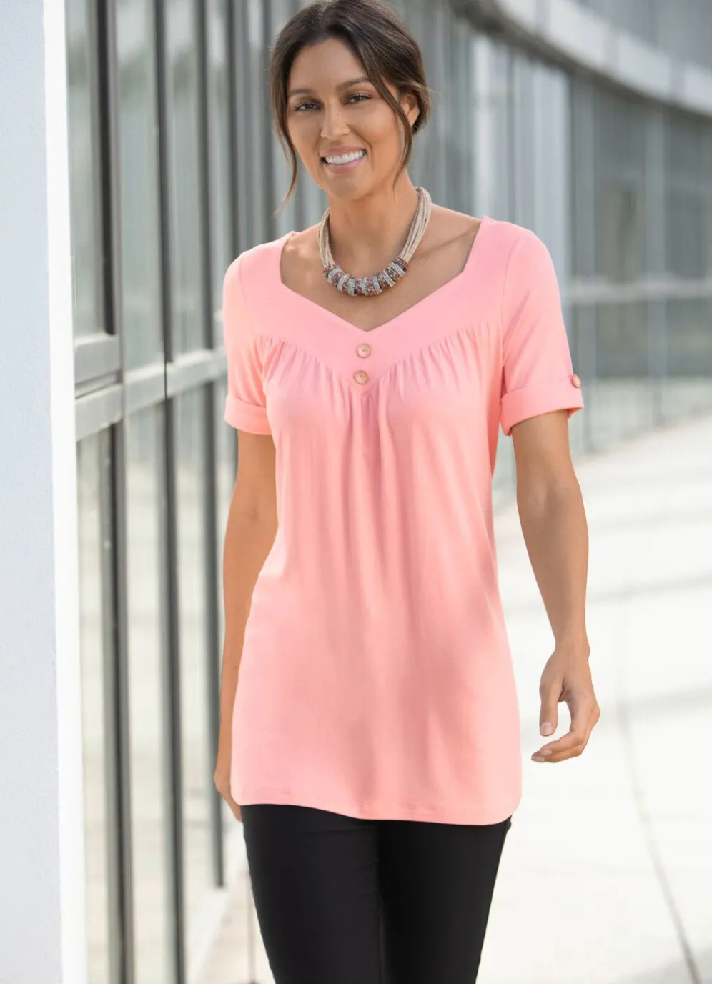 Zauberhafte Tunika mit Fältelung am V-Ausschnitt sowie Zierknöpfen im Vorderteil und an den kurzen Ärmeln mit Umschlag.