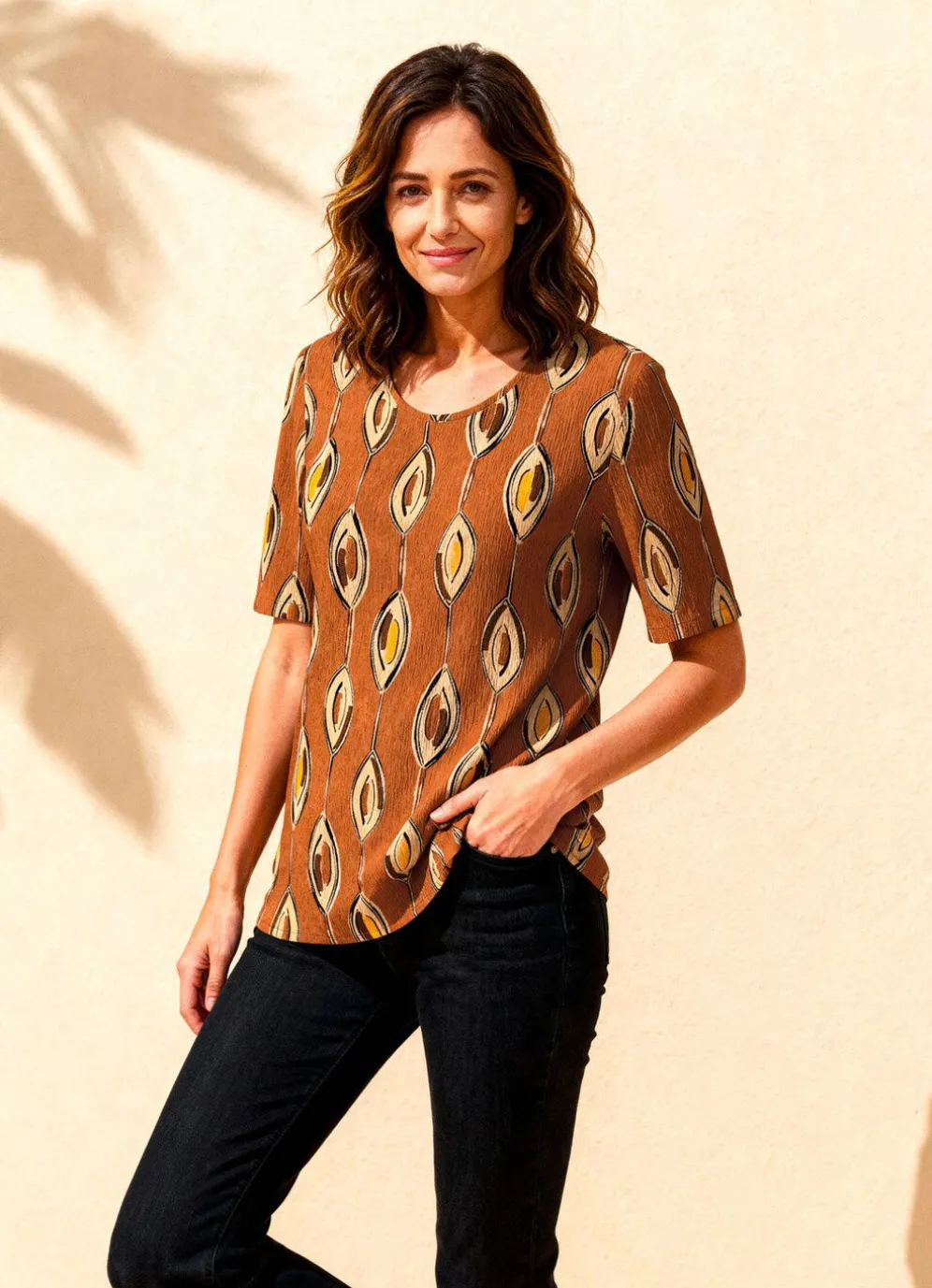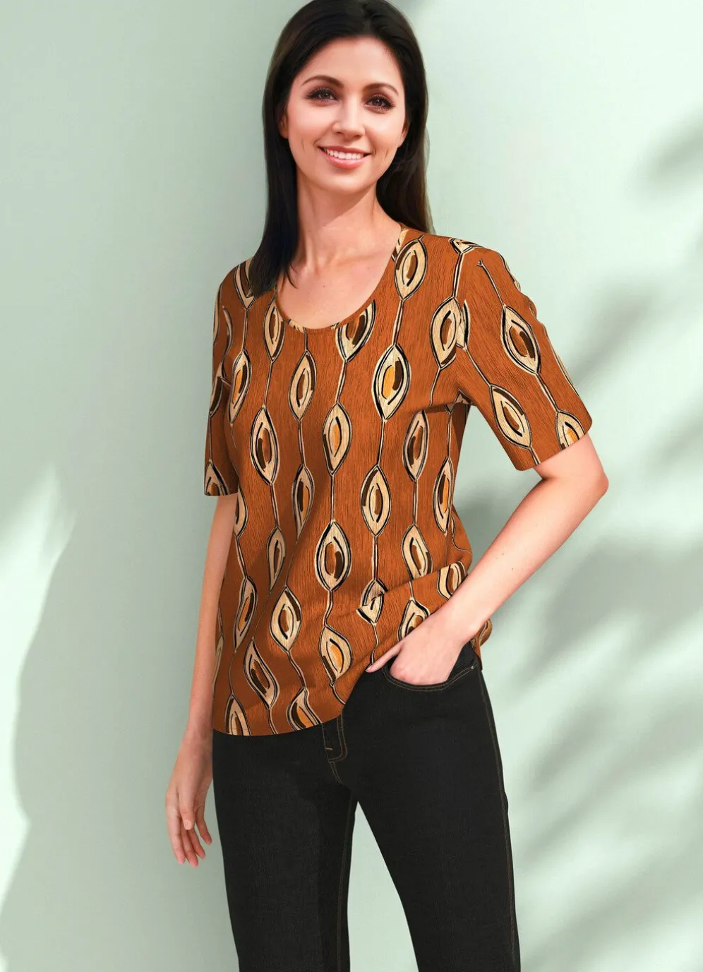 Attraktive Tunika mit farbbrillantem braun-beige-schwarz-buntem Druck, mit eingefasstem, rundem Halsausschnitt, halblangen Ärmeln sowie Bewegungsfalte im Rückteil.