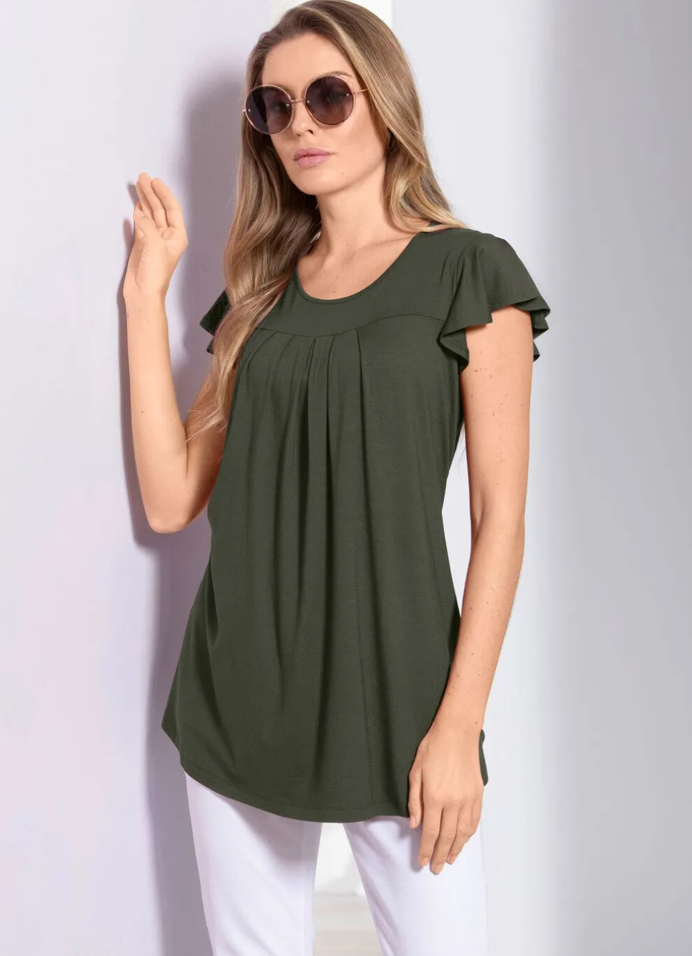 Bezaubernde Shirt-Tunika mit rundem Halsausschnitt, kurzen Volantärmeln, Vorderpasse mit hübscher Fältelung.